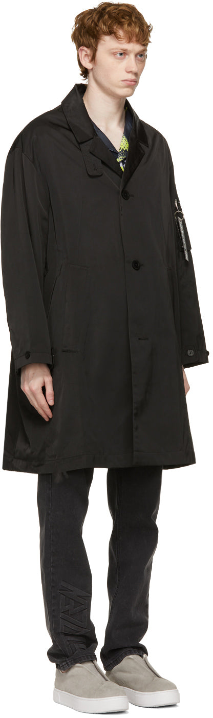 Long sleeve recycled technical twill coat in black. Strap with button fastening featuring tonal embroidered logo at notched lapel collar. Button closure at front. Welt pockets at waist. Zippered utility pocket featuring tonal textile logo patch and detachable logo keychain at sleeve. Adjustable buttoned tabs at cuffs. Tonal bonded logo at back collar. Central vent at back hem. Welt pockets and tonal detachable and adjustable webbing strap featuring strap pad and bonded logo pattern in white at interior. Tonal striped twill lining. Fully lined. Tonal and silver-tone hardware. Supplier color: Black 100% recycled polyester. Brand: Stolen Girlfriends Club