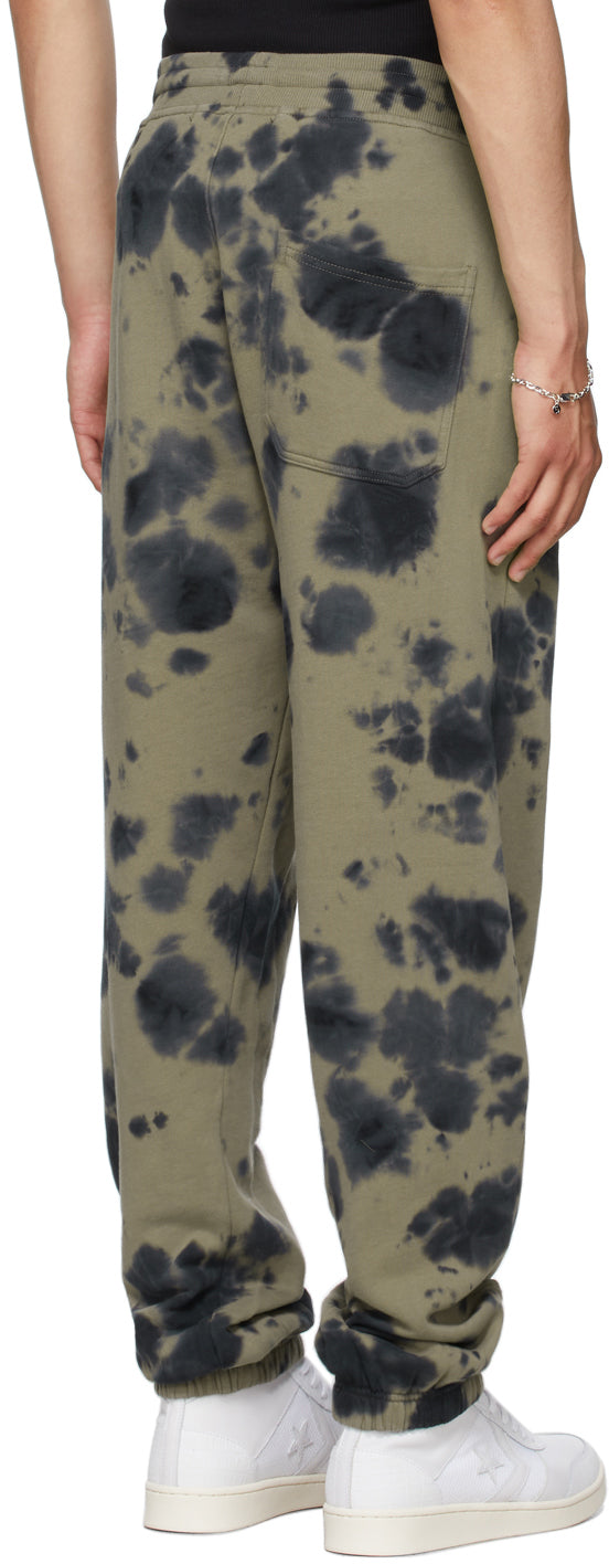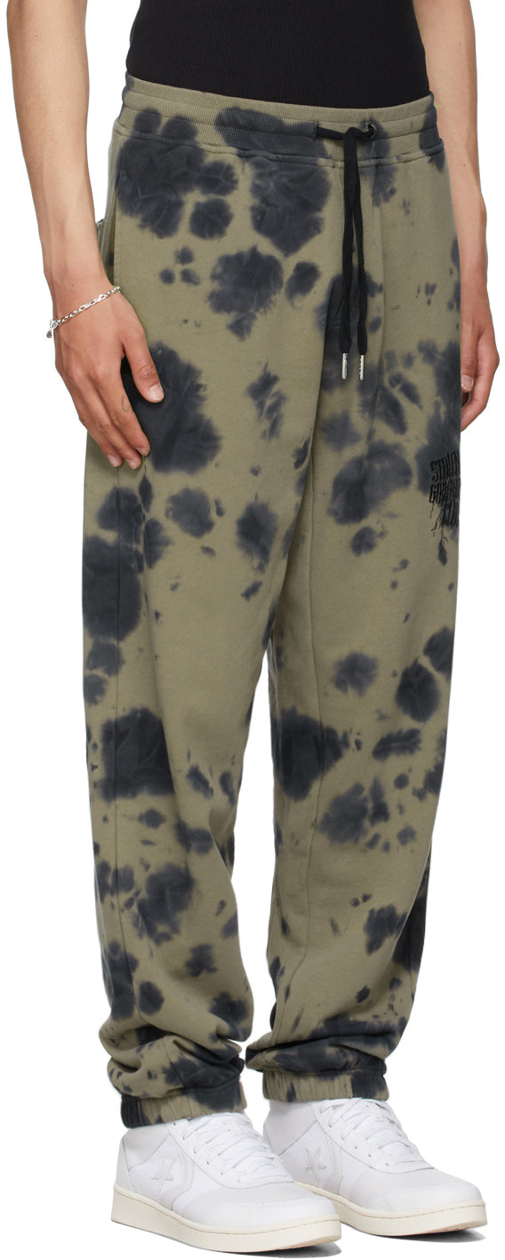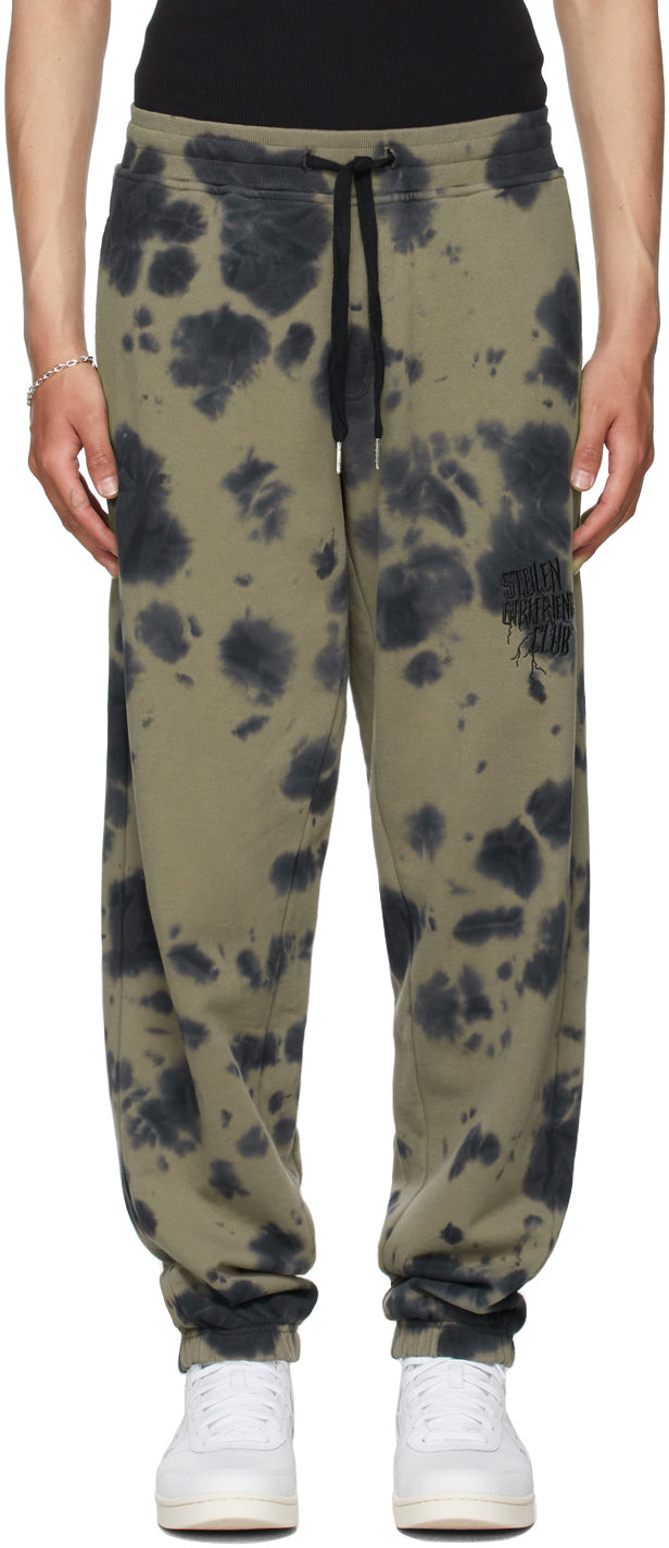 Tapered cotton fleece lounge pants in khaki featuring tie-dye pattern in tones of navy throughout. Mid-rise. Two-pocket styling. Logo embroidered at leg. Drawstring in navy at rib knit elasticized waistband. Elasticized cuffs. Each item is unique. Please note that coloration may vary. Supplier color: Khaki 100% cotton. Brand: Stolen Girlfriends Club