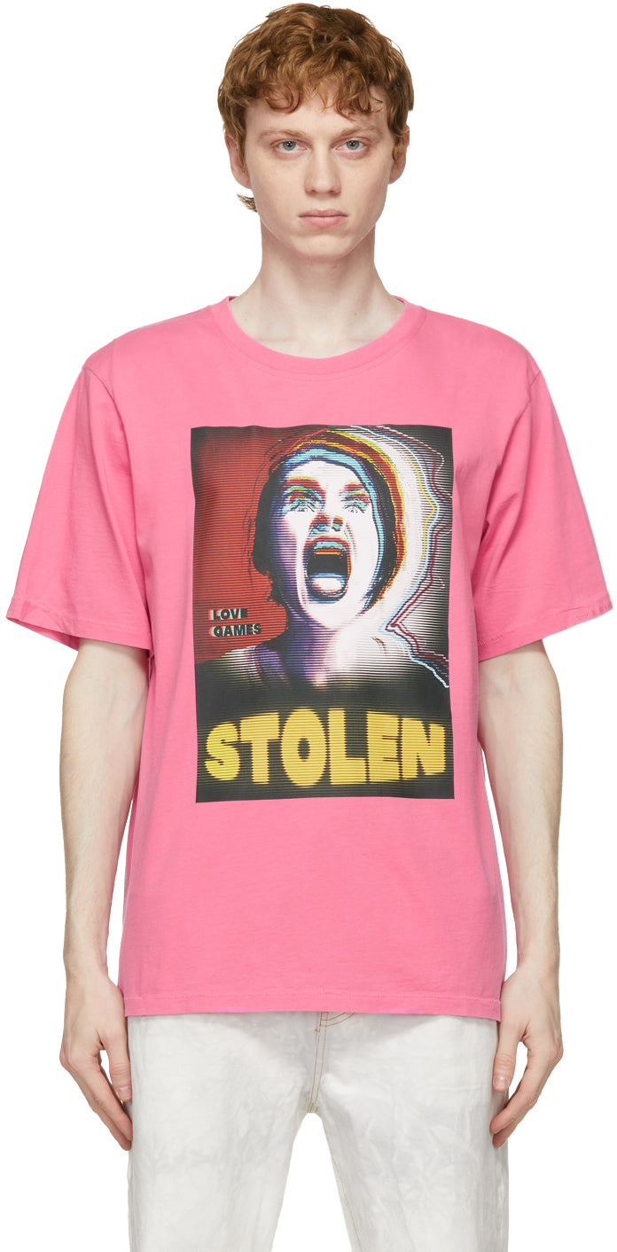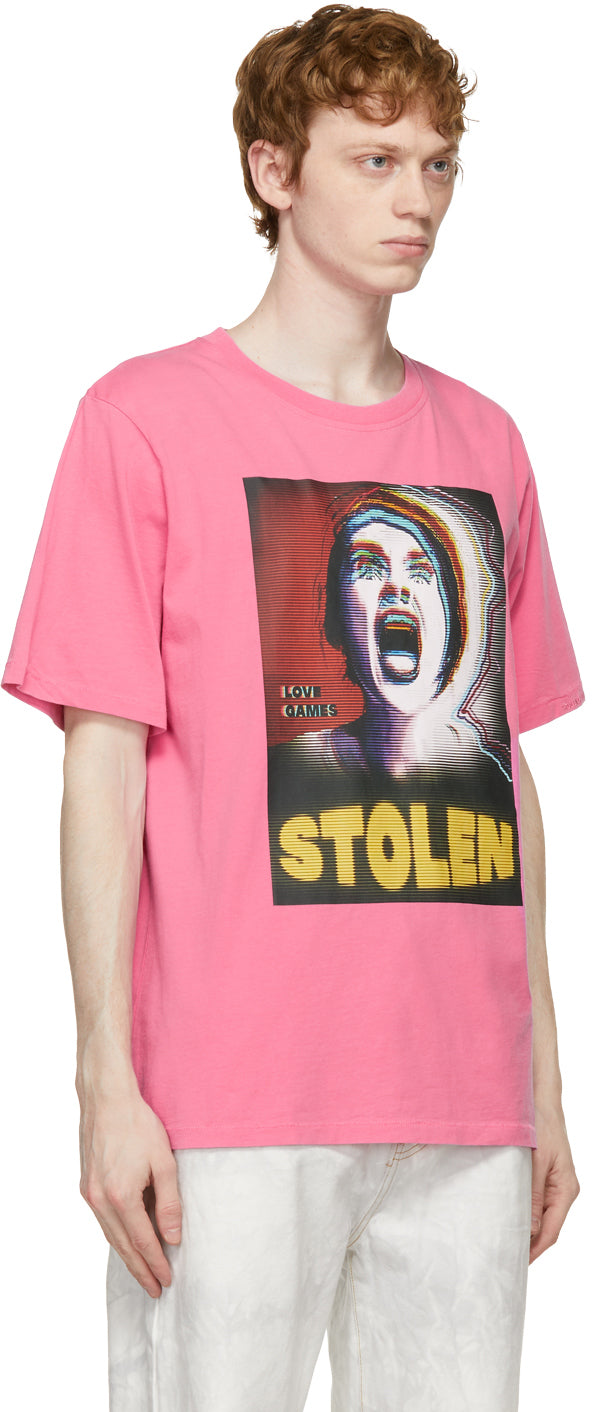 Short sleeve organic cotton jersey T-shirt in pink. Rib knit crewneck collar. Multicolor graphic printed at front. Tonal embroidered eyelets at armscyes. Tonal embroidered logo at cuff. Darts at back. Supplier color: Pink 100% organic cotton. Brand: Stolen Girlfriends Club
