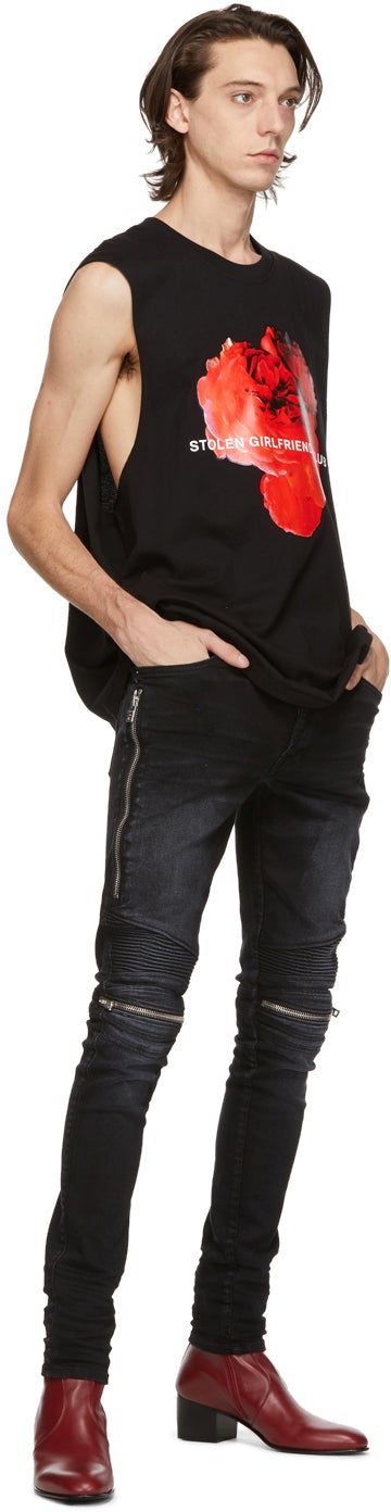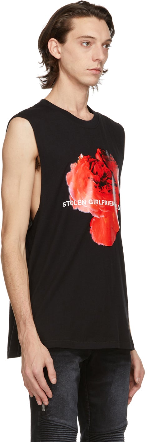 Sleeveless cotton jersey tank top in black. Rib knit crewneck collar. Logo graphic printed in red and white at front. Raw edge at armscyes. Supplier color: Black 100% cotton. Brand: Stolen Girlfriends Club