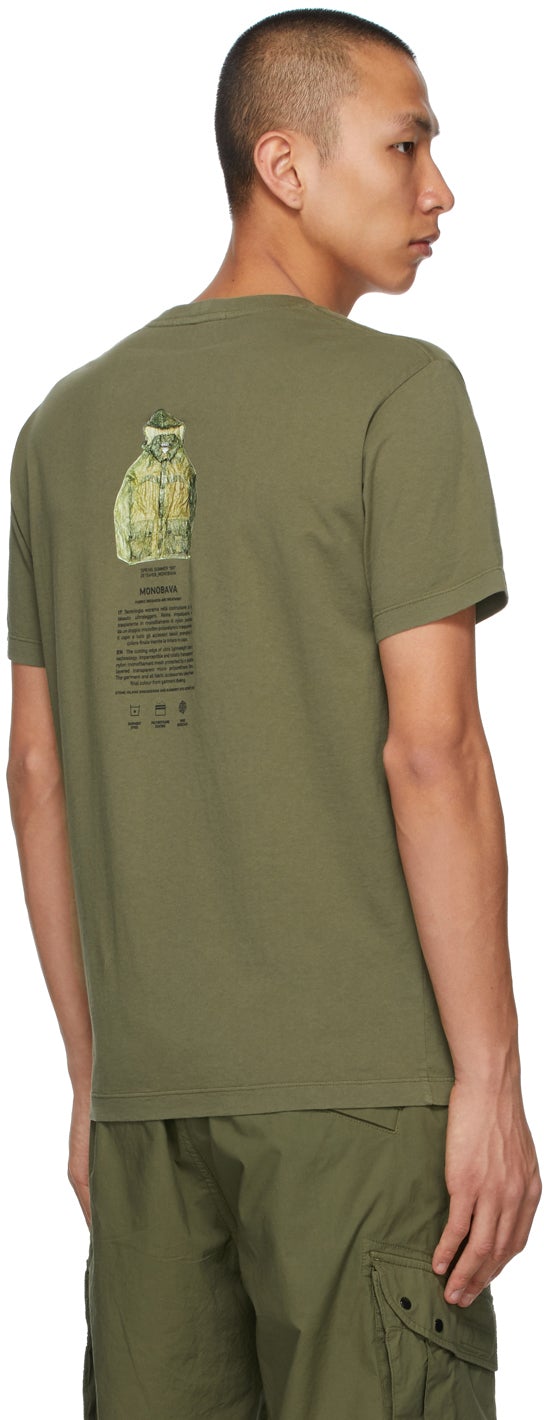 Short sleeve cotton jersey T-shirt in khaki. Rib knit crewneck collar. Logo printed and style name embroidered in black at chest. Text and graphic printed in multicolor at back. Supplier color: Olive Supplier code: 74152NS91 100% cotton. Brand: Stone Island
