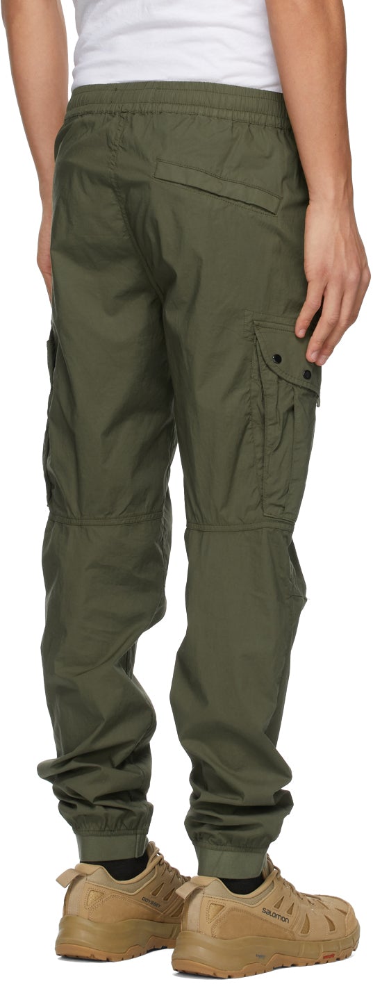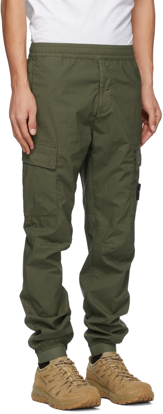 Tapered garment-dyed stretch cotton cargo pants in khaki. Mid-rise. Three-pocket styling. Concealed drawstring at waistband. Patch pockets and detachable felted logo patch in black at outseams. Tonal elasticized trim at cuffs. Zip-fly. Black hardware. Supplier color: Olive Supplier code: 741531303 97% cotton, 3% elastane. Brand: Stone Island