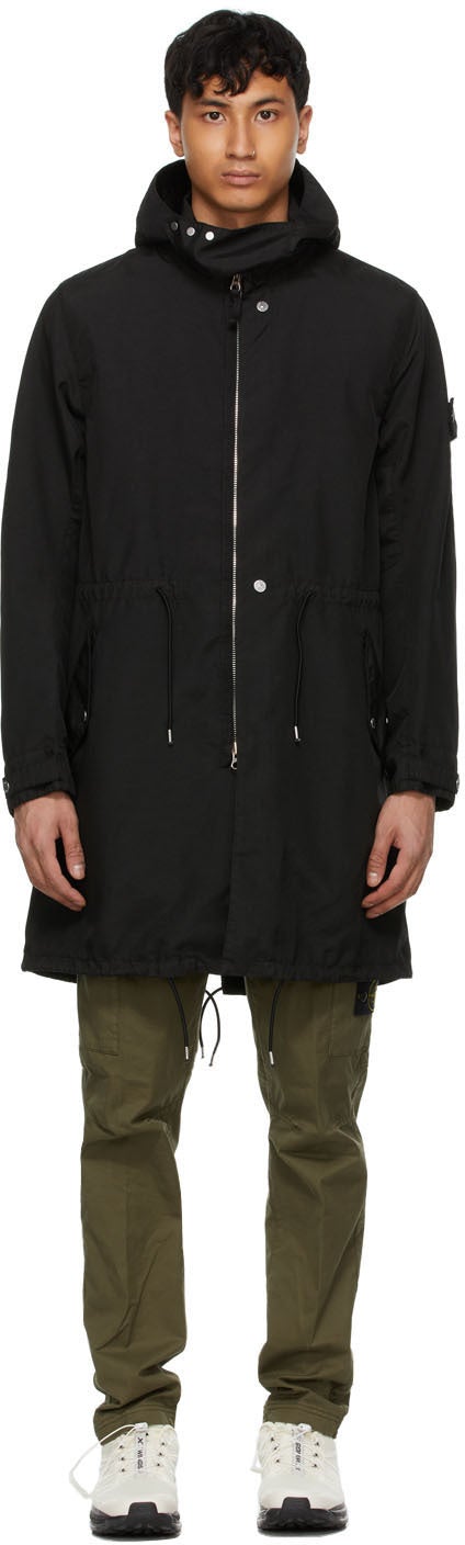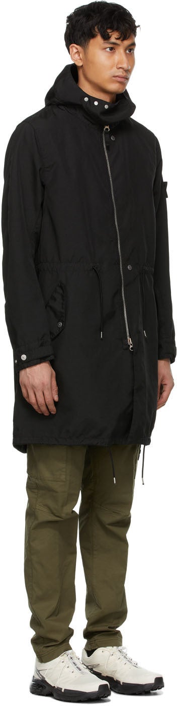 Long sleeve garment-dyed Hollowcore canvas coat in black. Water-repellent. Adjustable throat guard with press-stud fastening at hood. Two-way zip closure with concealed press-stud placket at front. Tonal detachable embroidered logo patch with button fastening at sleeve. Elasticized drawstring and flap pockets at waist. Adjustable press-stud-tab at cuffs. Elasticized drawstring at fishtail hem. Detachable webbing shoulder straps with press-stud fastening at interior. Unlined. Logo-engraved black and silver-tone hardware. Supplier color: Black Supplier code: 741970102 100% polyester. Brand: Stone Island Shadow Project