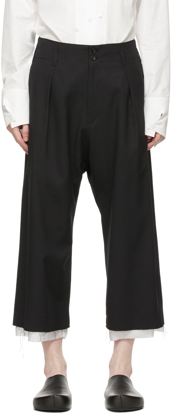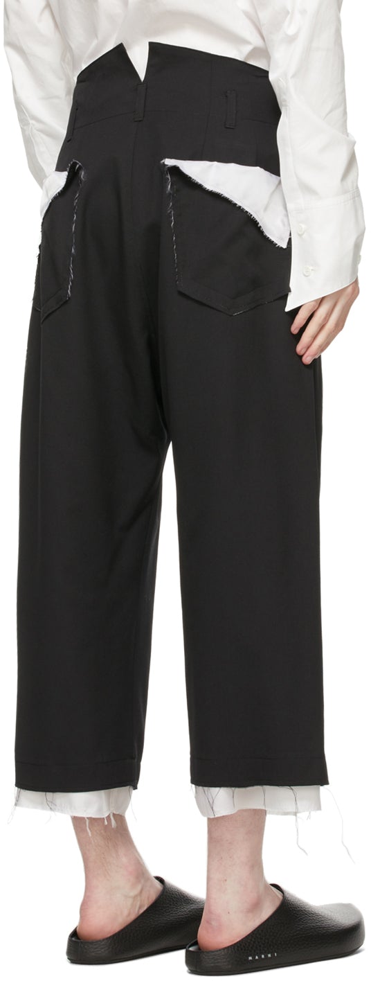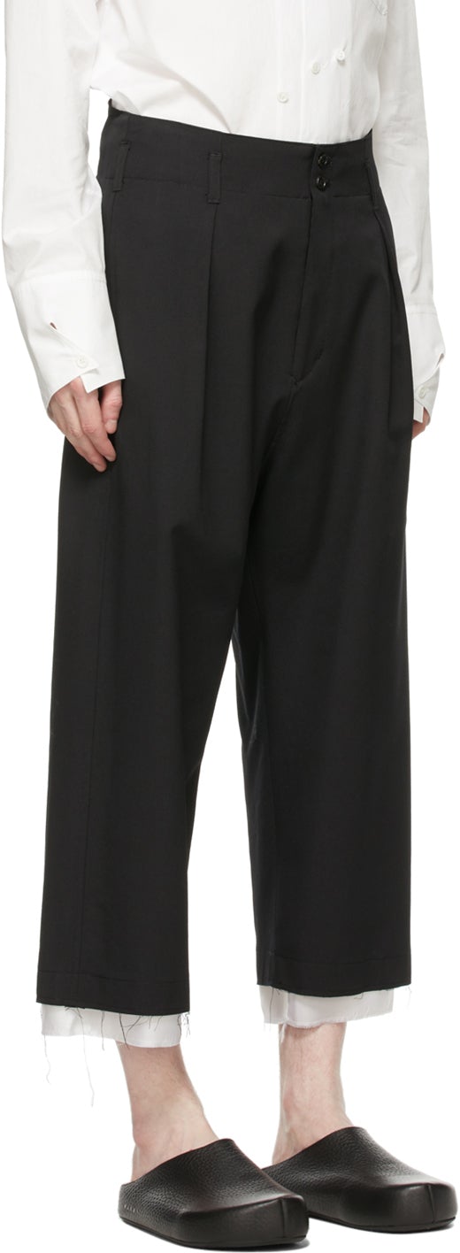 Straight-leg wool twill trousers in black. Mid-rise. Satin trim in white throughout. Four-pocket styling. Belt loops and pleats at waistband. Notch at back waistband. Raw edges at cuffs. Zip-fly. Satin lining in white. Tonal hardware. Supplier color: Black Body: 100% wool. Lining: 100% cupro. Brand: Sulvam