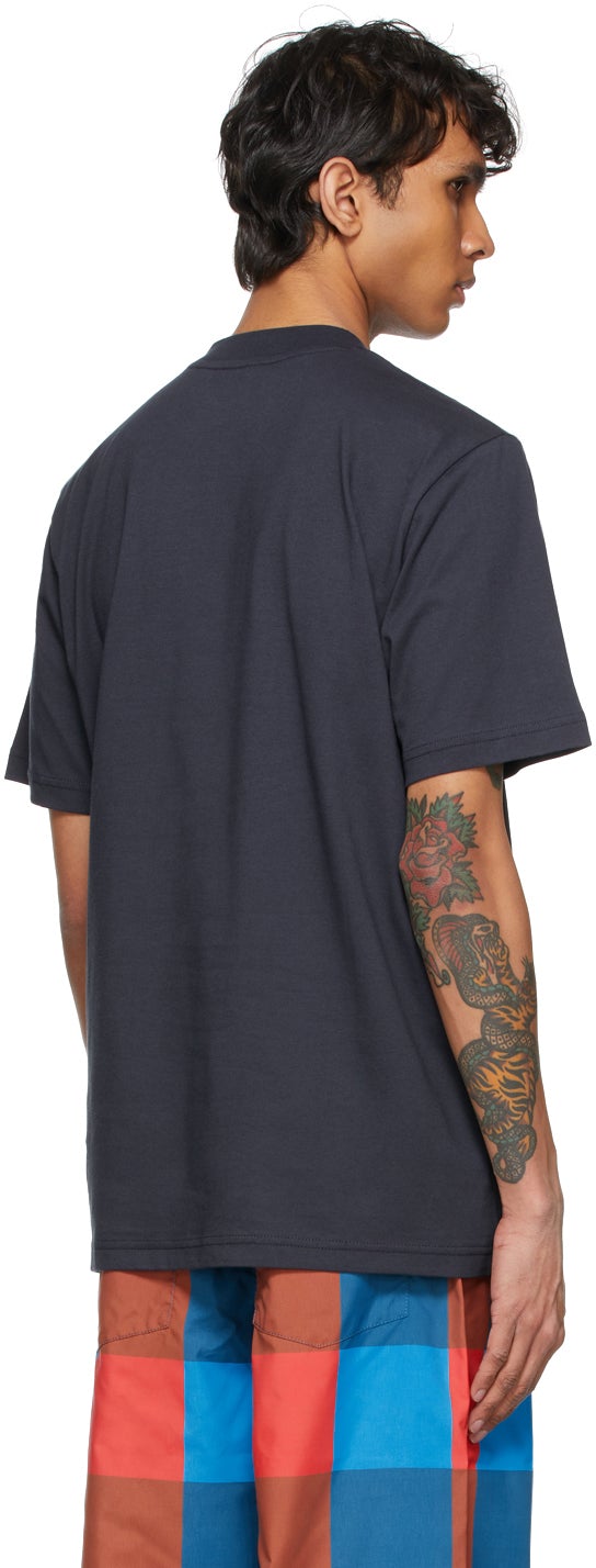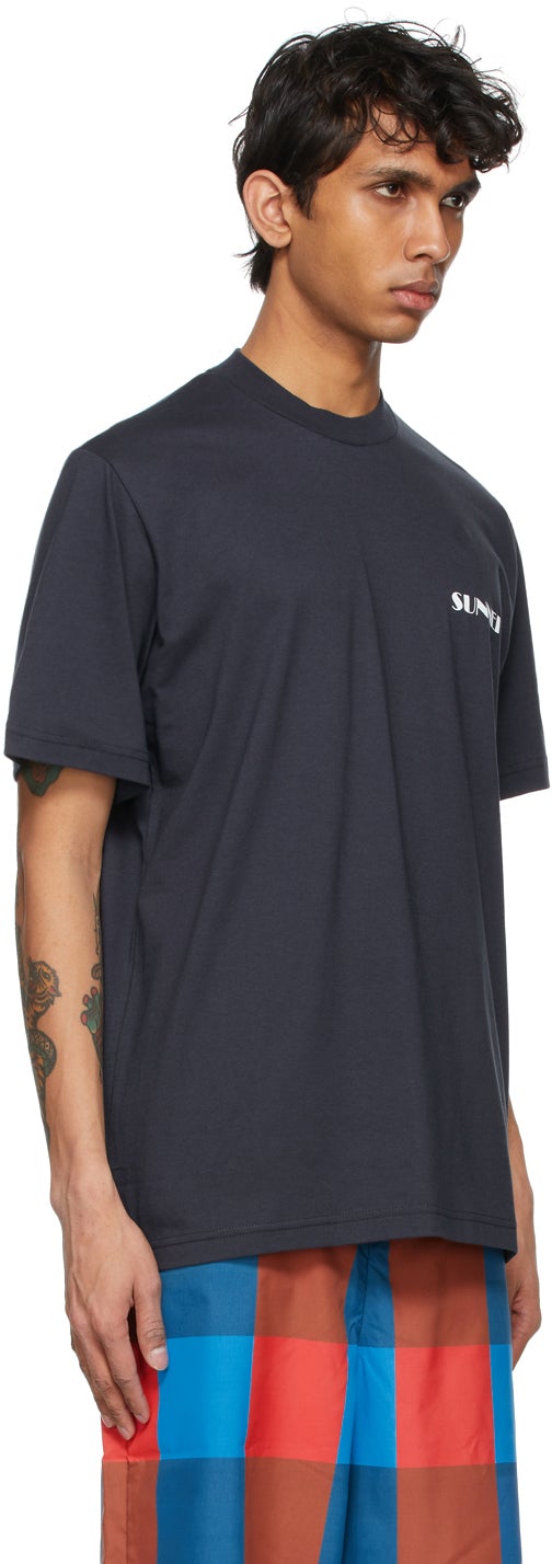 Short sleeve cotton jersey T-shirt in navy. Rib knit crewneck collar. Logo printed in white at chest. Textile logo flag in white at side-seam. Supplier color: Blue/White logo Body: 100% cotton. Trim: 95% cotton, 5% elastane. Brand: Sunnei