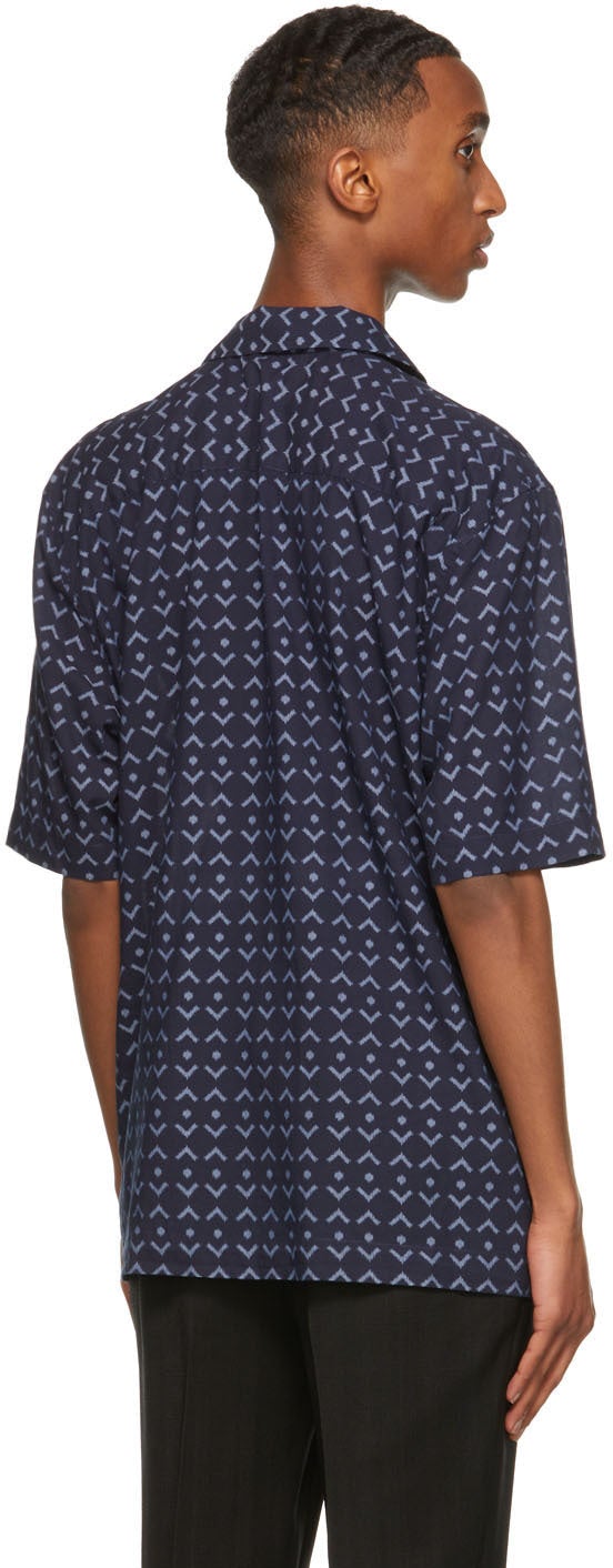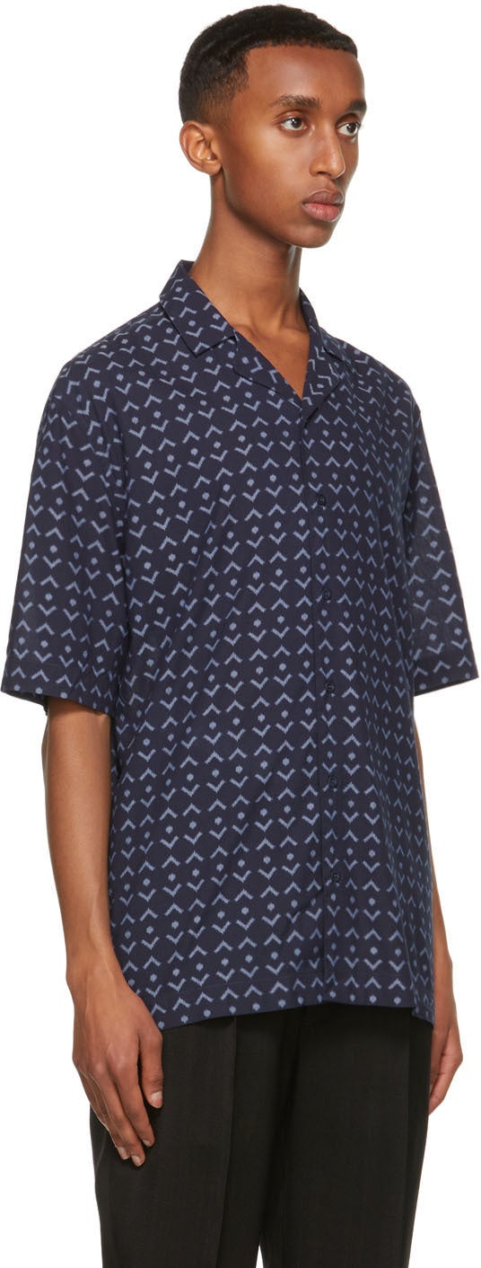 Short sleeve cotton poplin shirt in navy featuring graphic print in blue throughout. Open spread collar. Button closure at front. Tonal hardware. Supplier color: Navy/Chambray 100% cotton. Brand: Sunspel