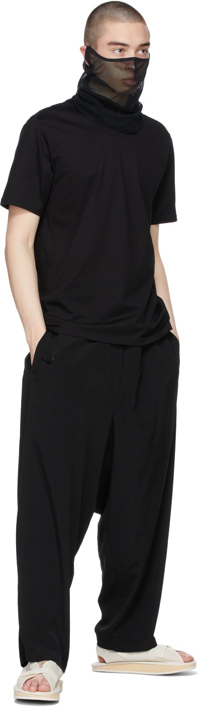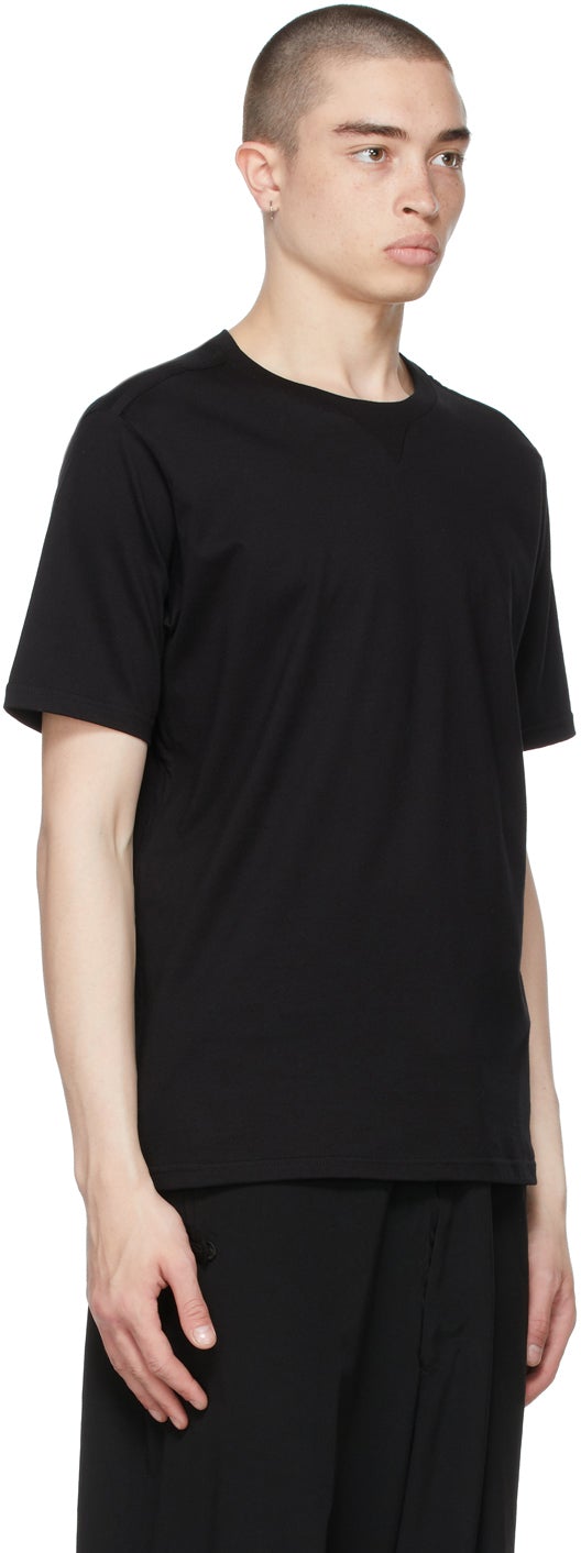 Short sleeve cotton jersey T-shirt in black. Rib knit crewneck collar. Central seam at back. Supplier color: Black 100% cotton. Brand: TAKAHIROMIYASHITA TheSoloist.