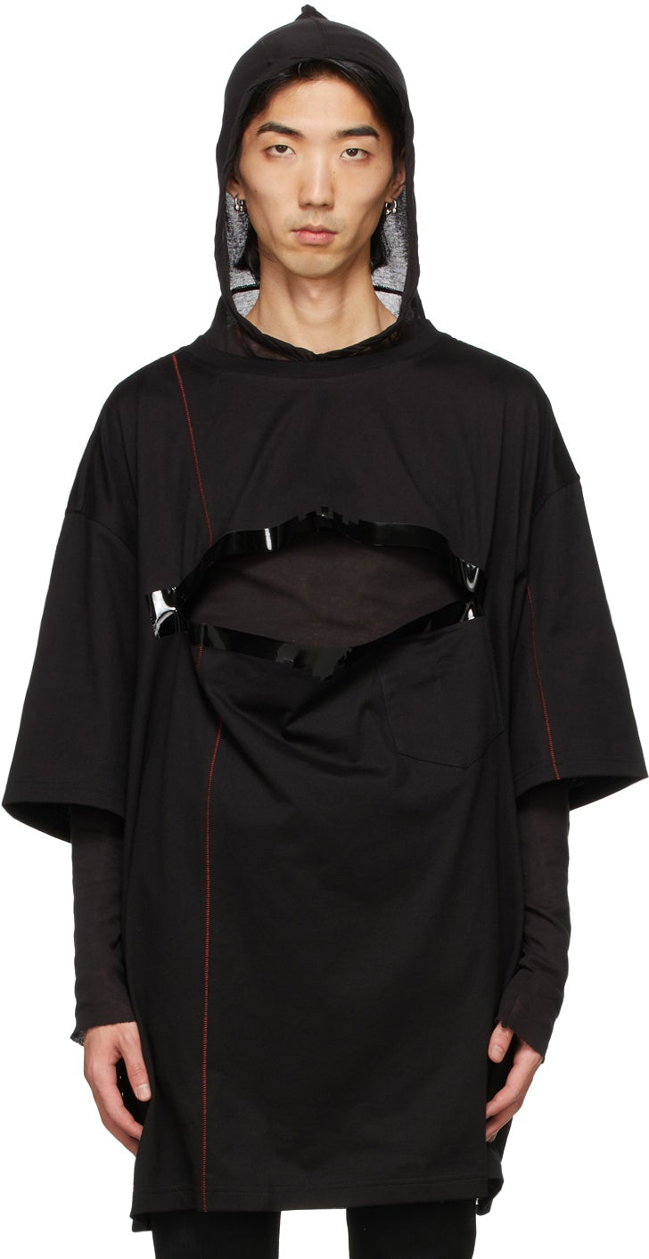 Short sleeve cotton jersey T-shirt in black. Rib knit crewneck collar. Cut-out and tonal bonded trim at front. Contrast stitching in red. Supplier color: Black gloss 100% cotton. Brand: TAKAHIROMIYASHITA TheSoloist.
