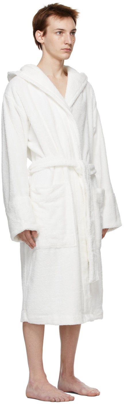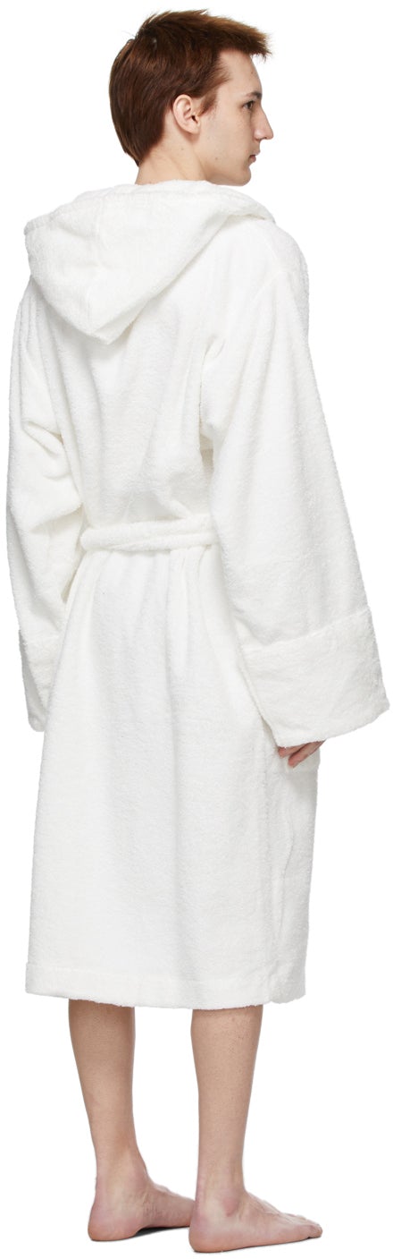 Long sleeve organic cotton terrycloth bathrobe in white. Hood. Shawl collar. Patch pockets and detachable self-tie fastening at waist. Supplier color: Snow white 100% organic cotton. Brand: Tekla