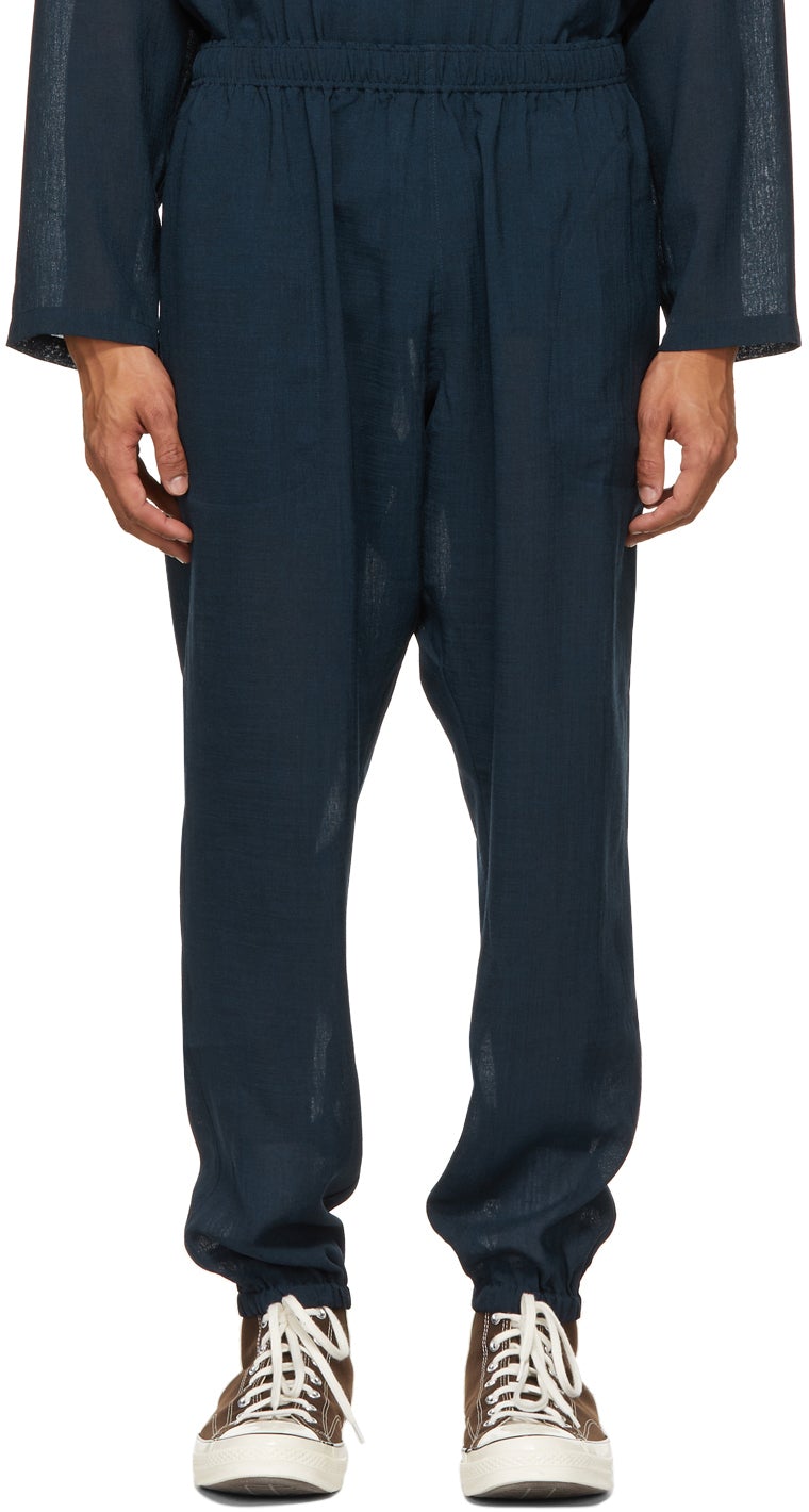 Tapered plain woven trousers in navy. Mid-rise. Two-pocket styling. Concealed drawstring at elasticized waistband. Elasticized cuffs. Supplier color: Navy 60% triacetate, 40% polyester. Brand: The Conspires