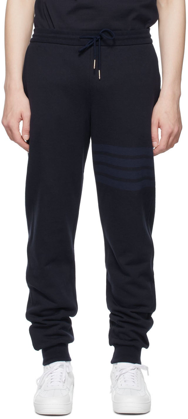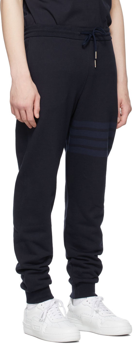 Tapered French terry lounge pants in navy. Mid-rise. Three-pocket styling. Drawstring at rib knit elasticized waistband. Signature tricolor grosgrain flag at back waistband. Tonal signature intarsia stripes at leg. Rib knit cuffs. Silver-tone hardware. Supplier color: Navy 100% cotton. Brand: Thom Browne
