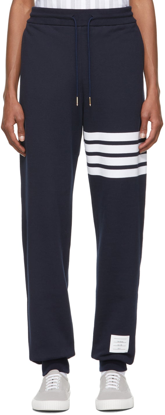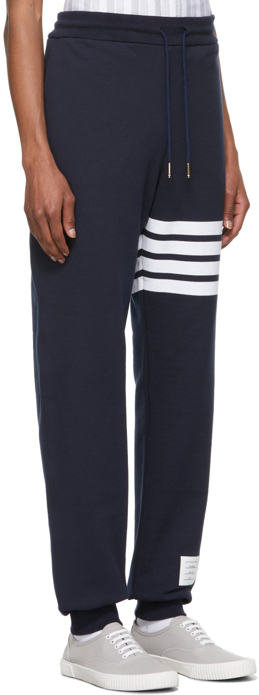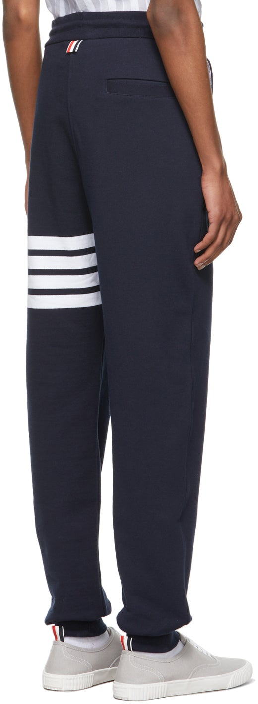 Slim-fit French terry lounge pants in navy. Mid-rise. Three-pocket styling. Drawstring at waistband. Signature stripes in white at leg. Rib knit cuffs. Signature tricolor grosgrain flag at back waistband. Gold-tone hardware. Supplier color: Navy 100% cotton. Brand: Thom Browne