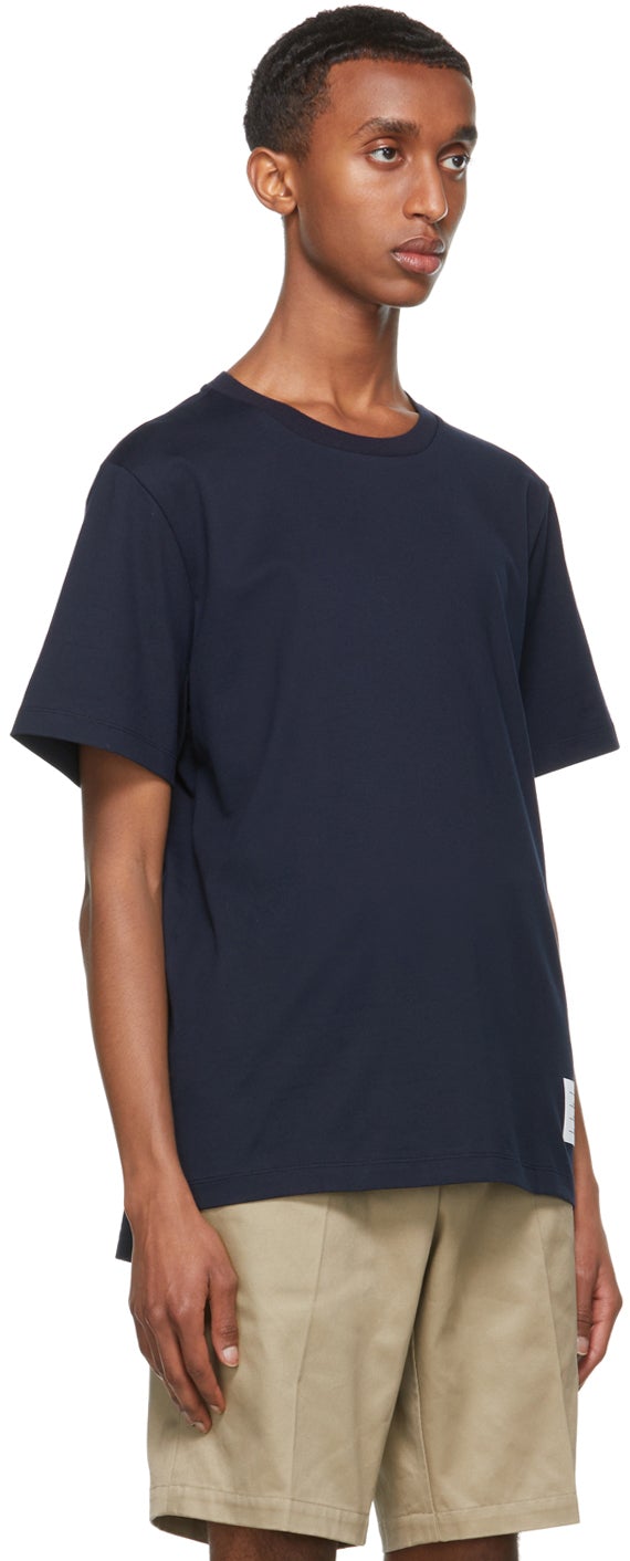 Short sleeve cotton jersey T-shirt in navy. Rib knit crewneck collar. Textile logo patch in white at hem. Concealed knit signature tricolor trim at vented side-seams. Signature tricolor grosgrain flag at back collar. Supplier color: Navy 100% cotton. Brand: Thom Browne