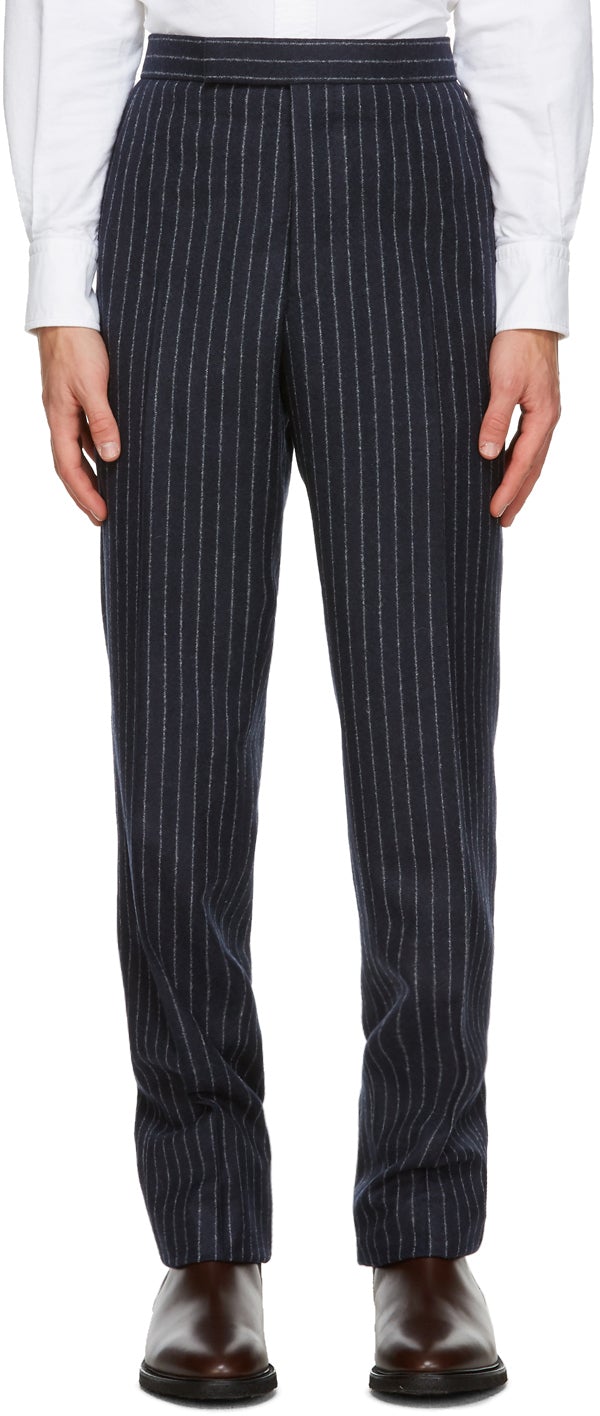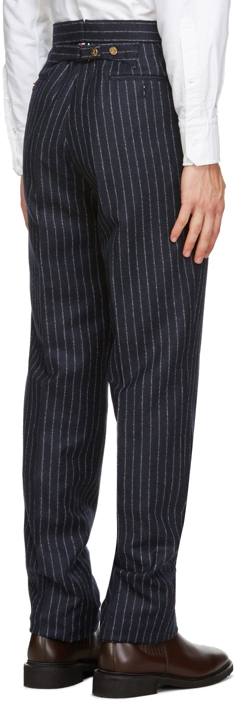 Straight-leg wool flannel trousers striped in navy and grey. Mid-rise. Four-pocket styling. Signature tricolor grosgrain flag and adjustable buttoned tabs at back waistband. Central creases at front and back. Unfinished hem. Button-fly. Tricolor striped satin lining. Supplier color: Navy Body: 100% wool. Lining: 100% cupro. Brand: Thom Browne