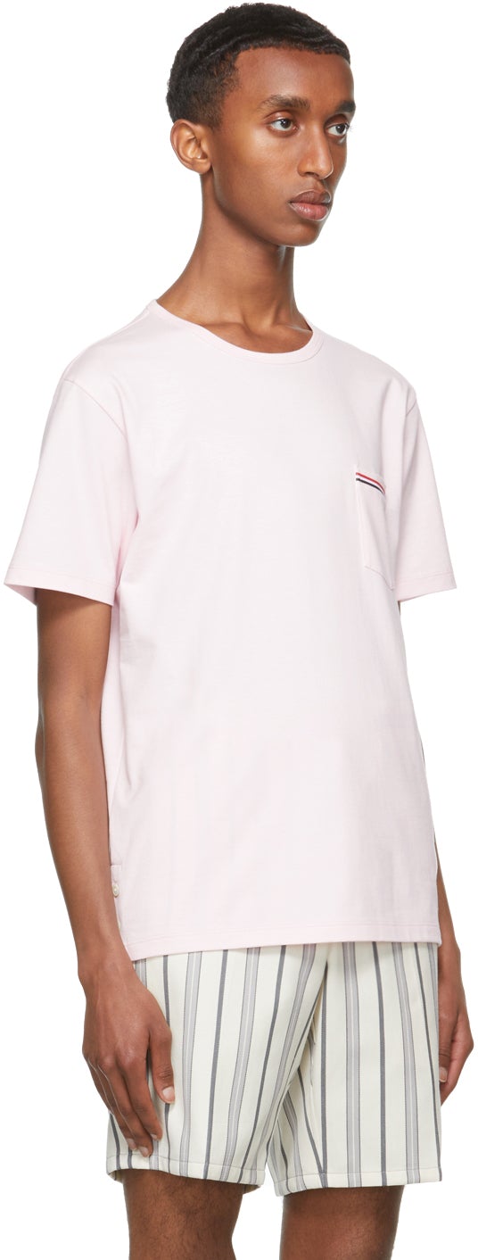 Short sleeve cotton jersey T-shirt in pink. Crewneck collar. Patch pocket featuring signature tricolor stripes at chest. Textile logo patch in white at front hem. Buttoned vent and signature tricolor grosgrain trim at side-seams. Signature tricolor grosgrain flag at back collar. Mother-of-pearl hardware. Supplier color: Light pink 100% cotton. Brand: Thom Browne