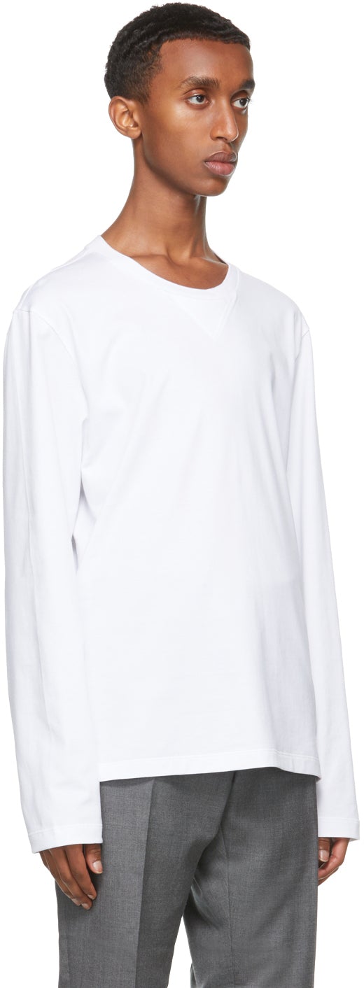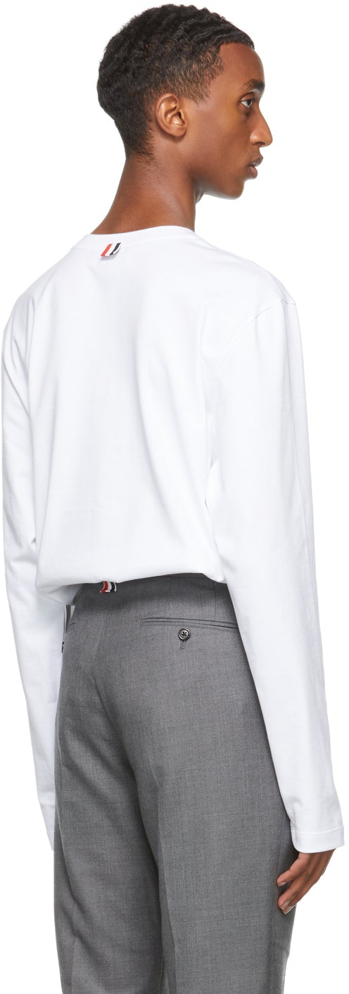Long sleeve cotton jersey T-shirt in white. Gusset at rib knit crewneck collar. Rib knit signature tricolor gusset at vented side-seams. Signature tricolor grosgrain flag at back collar. Drop-tail hem. Supplier color: White Body: 100% cotton. Trim: 95% cotton, 4% nylon, 1% polyurethane. Brand: Thom Browne