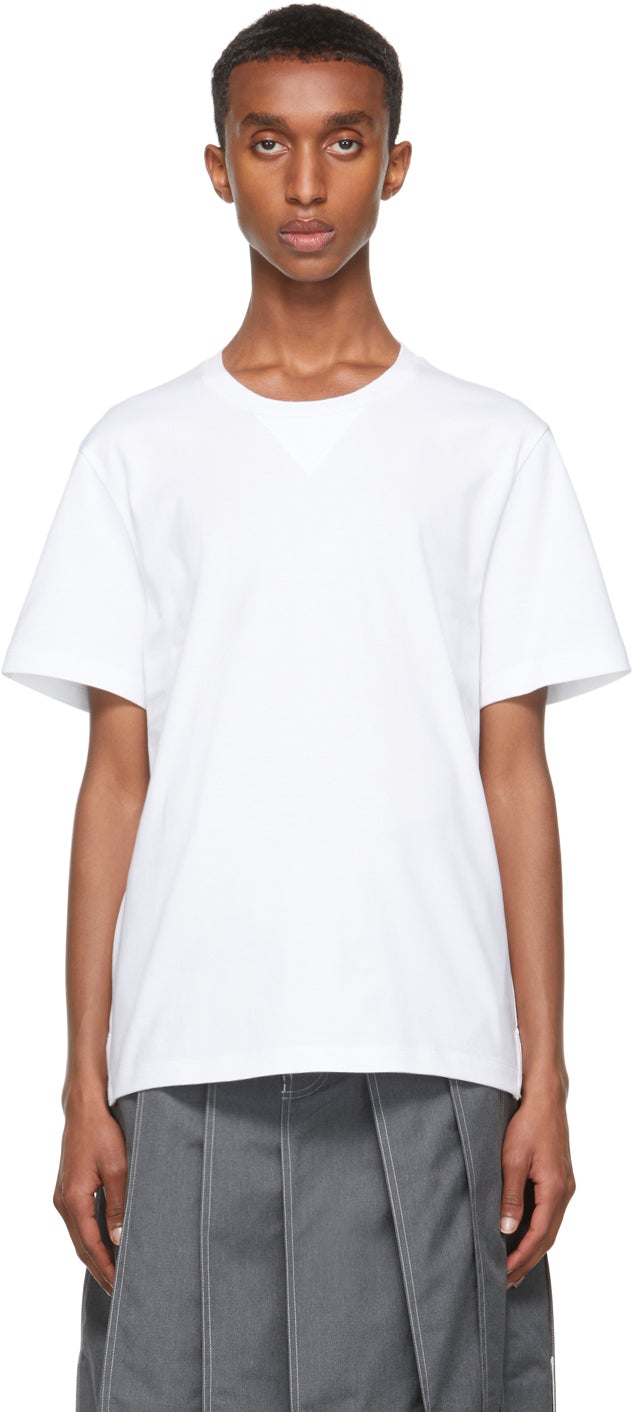 Short sleeve cotton jersey T-shirt in white. Gusset at rib knit crewneck collar. Rib knit signature tricolor gusset at vented side-seams. Signature tricolor grosgrain flag at back collar. Drop-tail hem. Supplier color: White Body: 100% cotton. Trim: 95% cotton, 4% nylon, 1% polyurethane. Brand: Thom Browne