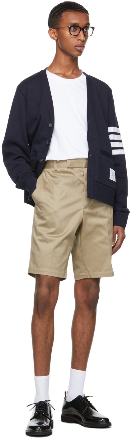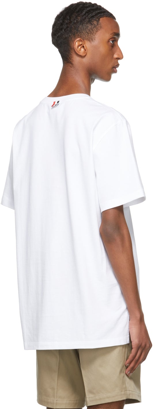 Short sleeve cotton jersey T-shirt in white. Rib knit crewneck collar. Tonal textile logo patch at front hem. Concealed signature tricolor grosgrain trim at vented side-seams. Signature tricolor grosgrain flag at back collar. Drop-tail hem. Supplier color: White 100% cotton. Brand: Thom Browne