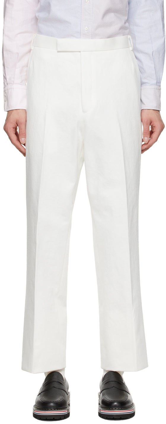 Straight-leg cotton twill trousers in white. Mid-rise. Four-pocket styling. Belt loops and signature striped grosgrain flag at waistband. Central crease at legs. Button-fly. Supplier color: White 100% cotton. Brand: Thom Browne