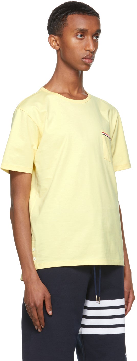 Short sleeve cotton jersey T-shirt in yellow. Rib knit crewneck collar. Patch pocket featuring knit signature tricolor trim at chest. Textile logo patch in white at front hem. Buttoned vent featuring concealed knit signature tricolor trim at side-seams. Signature tricolor grosgrain flag at back collar. Drop-tail hem. Supplier color: Light yellow 100% cotton. Brand: Thom Browne