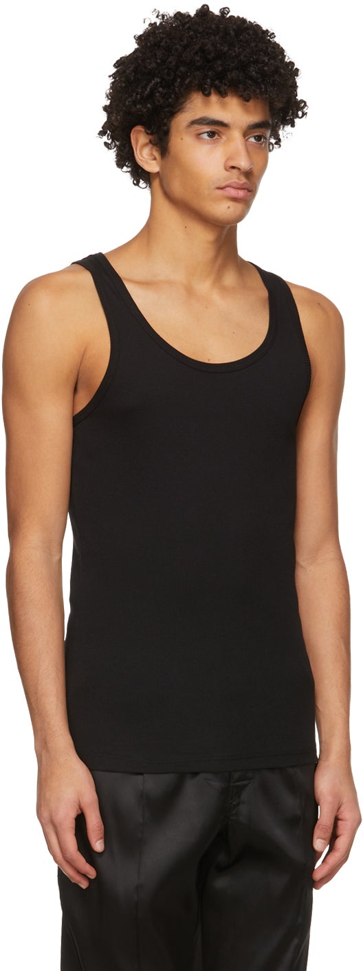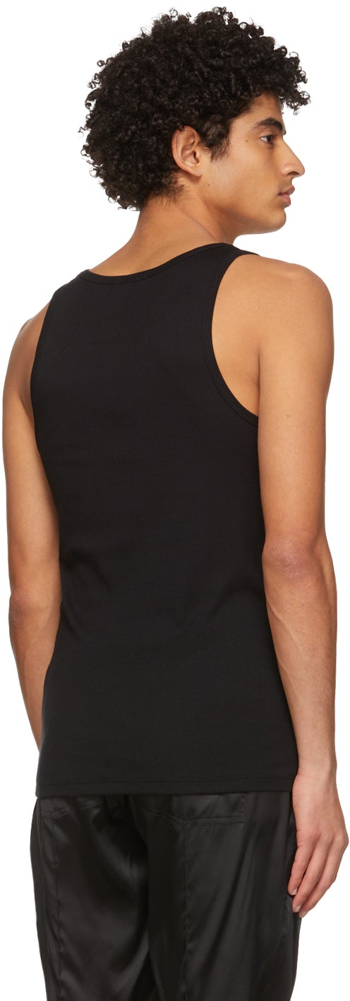 Sleeveless rib knit cotton and modal-blend tank top in black. Rib knit trim at crewneck collar and armscyes. Tonal textile logo patch at hem. Supplier color: Black 50% cotton, 50% modal. Brand: TOM FORD