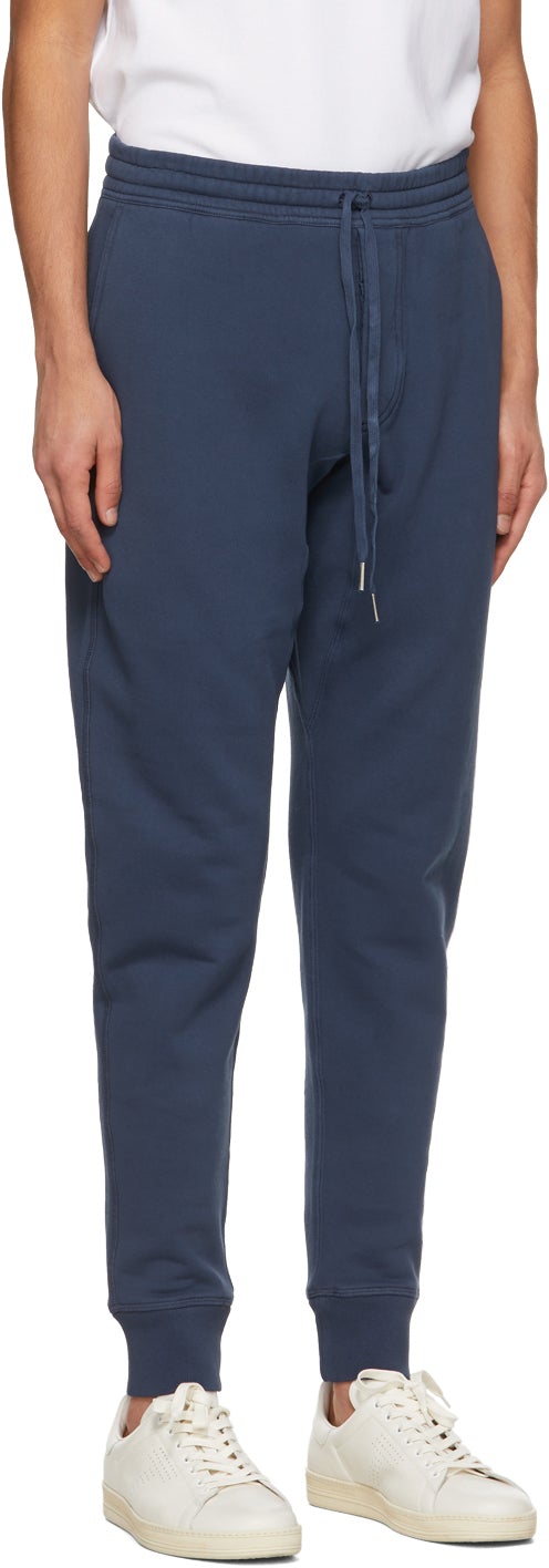 Slim-fit garment-dyed cotton fleece lounge pants in blue. Low-rise. Four-pocket styling. Drawstring at elasticized waistband. Rib knit cuffs. Button-fly. Supplier color: Dark blue 100% cotton. Brand: TOM FORD