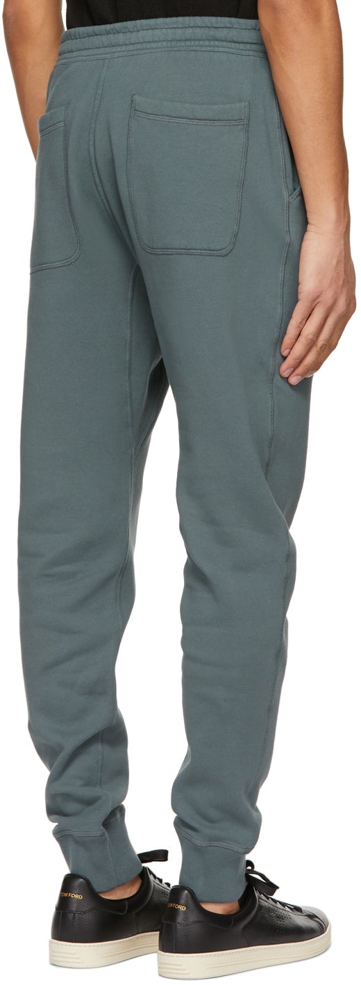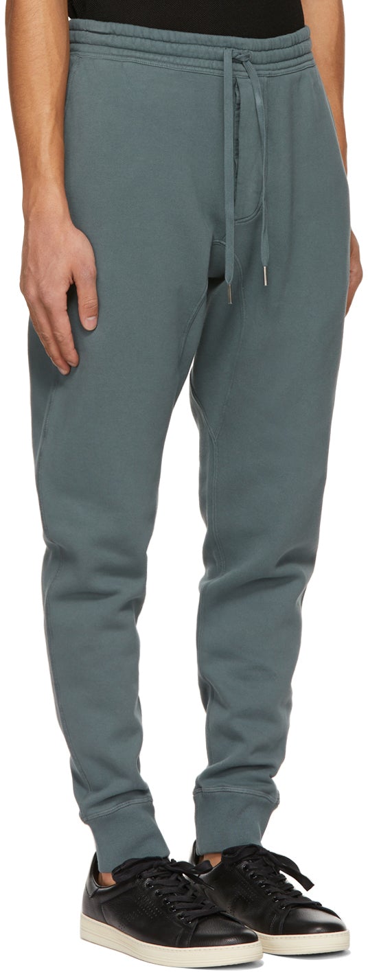 Relaxed-fit garment-dyed cotton fleece lounge pants in green. Mid-rise. Four-pocket styling. Drawstring at elasticized waistband. Rib knit cuffs. Button-fly. Antiqued silver-tone hardware. Supplier color: Petrol 100% cotton. Brand: TOM FORD