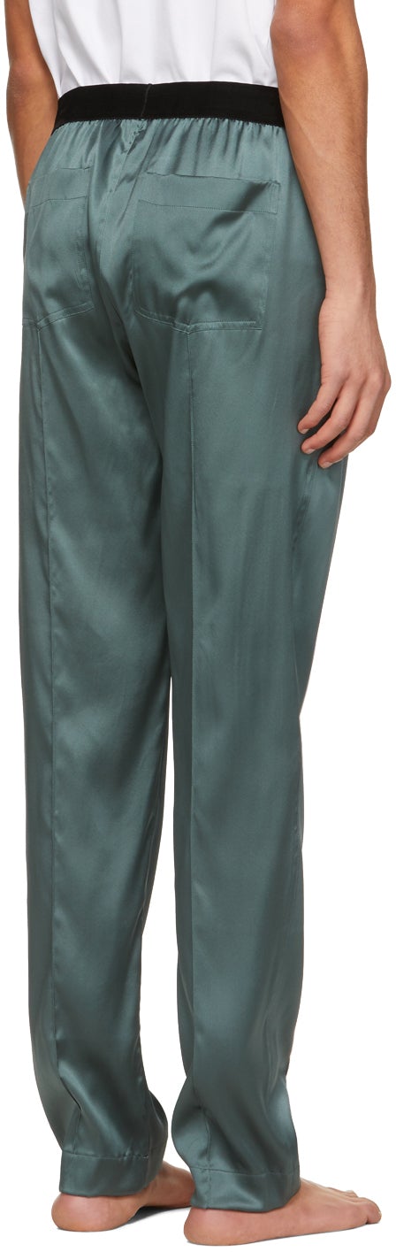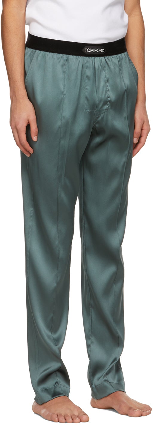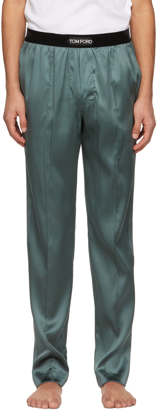 Relaxed-fit stretch silk satin pyjama pants in grey. Mid-rise. Four-pocket styling. Elasticized velvet waistband in black. Jacquard knit logo patch at front waistband. Button-fly. White hardware. Supplier color: Sage 93% silk, 7% elastane. Brand: TOM FORD