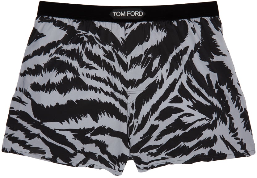 Stretch silk satin boxers in grey featuring graphic pattern in black. Mid-rise. Velvet trim in black and textile logo patch at elasticized waistband. Supplier color: Grey 93% silk, 7% elastane. Brand: TOM FORD