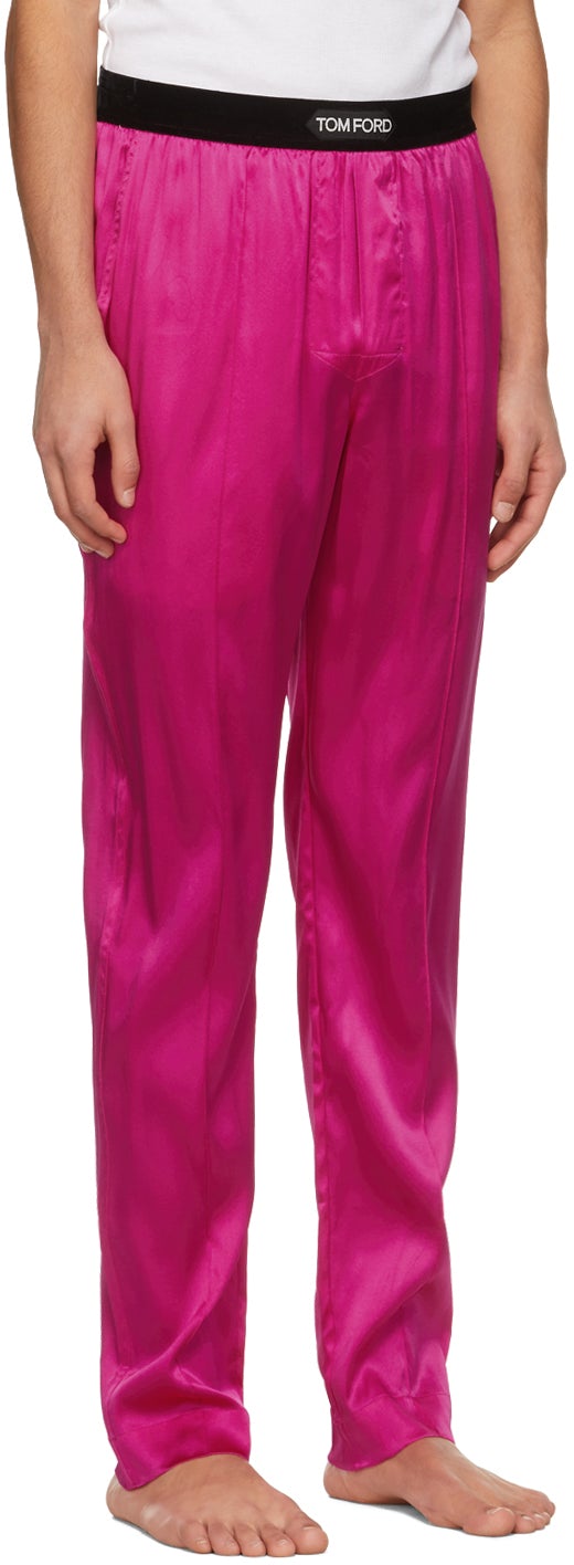 Relaxed-fit stretch silk satin pyjama pants in pink. Mid-rise. Four-pocket styling. Elasticized velvet waistband in black. Jacquard knit logo patch at front waistband. Button-fly. White hardware. Supplier color: Hot pink 93% silk, 7% elastane. Brand: TOM FORD