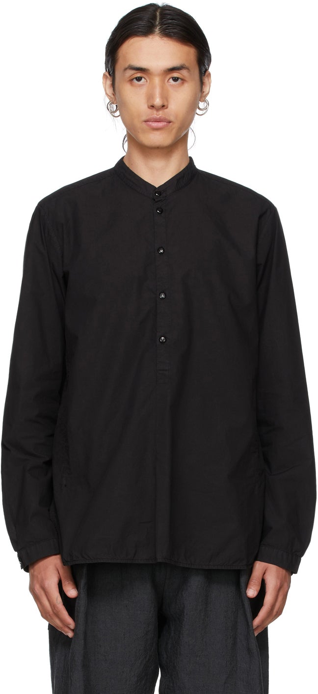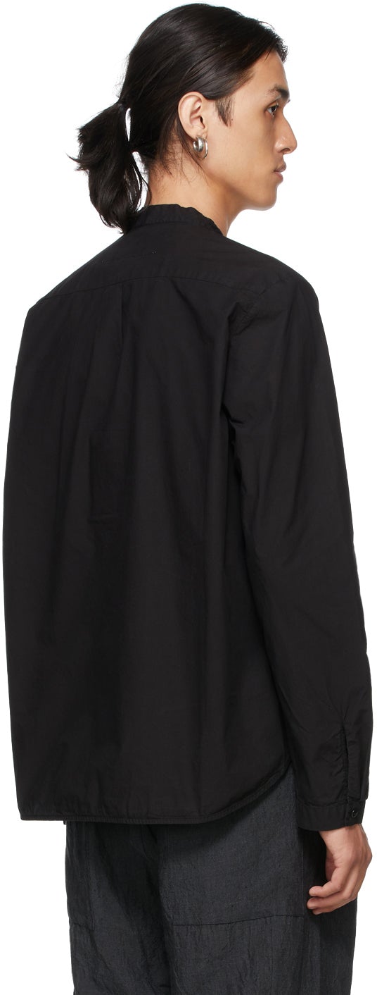Long sleeve cotton poplin shirt in black. Band collar. Button closure at front. Box pleat at back yoke. Shirttail hem. Vent at side seams. Tonal hardware. Supplier color: Black 100% cotton. Brand: Toogood
