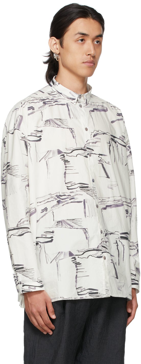 Long sleeve cotton poplin shirt in white featuring graphic pattern in tones of purple and black throughout. Spread collar. Button closure at front. Vent at side seams. Single-button barrel cuffs. Box pleat at back yoke. Tonal hardware. Supplier color: Ploughed fields 100% cotton. Brand: Toogood