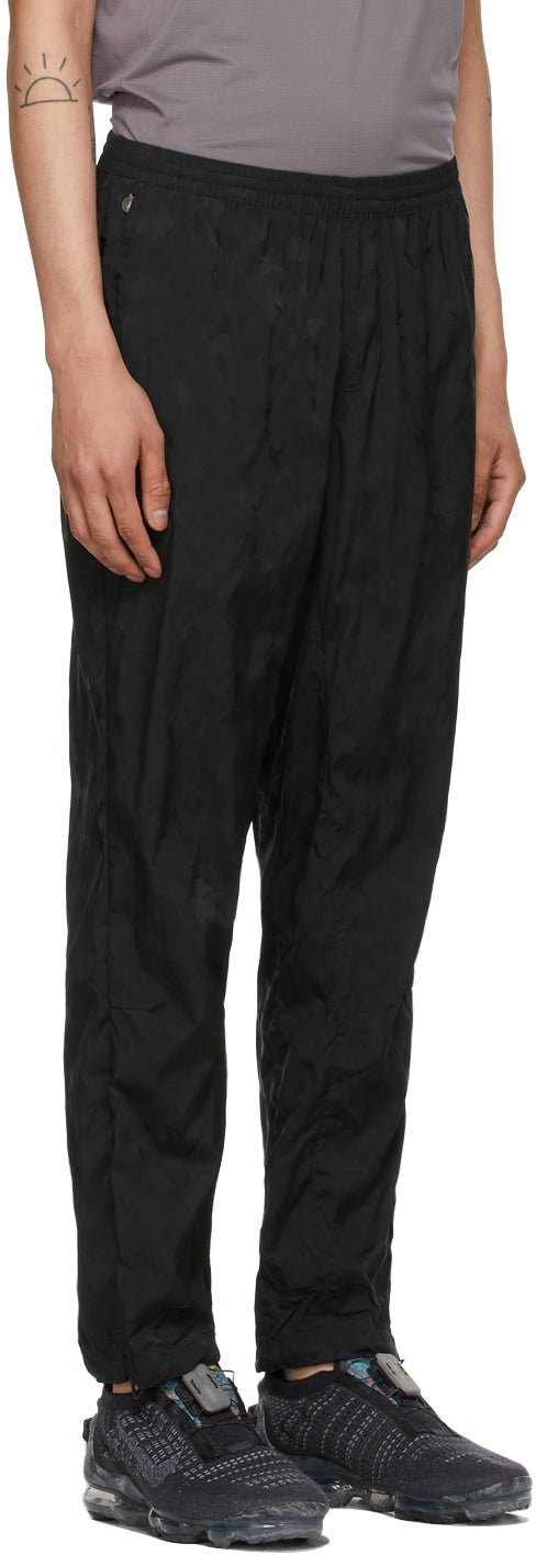 Straight-leg ECONYL® nylon taffeta lounge pants in black featuring tonal camouflage pattern. Mid-rise. Three-pocket styling. Concealed drawstring at elasticized waistband. Logo charm and textile logo patch at front. Bungee-style drawstring at cuffs. Gunmetal-tone hardware. Supplier color: Camo nero 100% polyamide. Brand: True Tribe