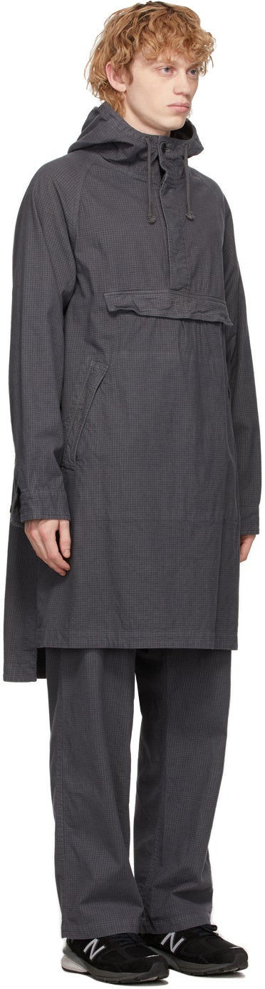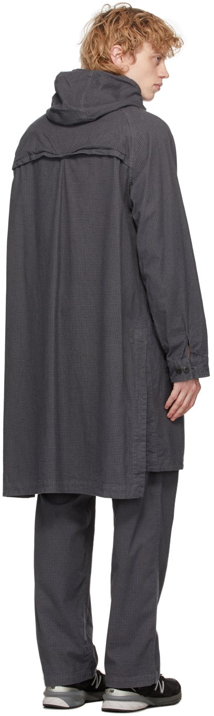 Long sleeve cotton-blend flannel coat in grey featuring tonal check pattern throughout. Drawstring at hood. Stand collar. Concealed four-button placket at front. Flap pocket at front. Welt pockets at waist. Adjustable two-button barrel cuffs. Stormflap at back. Vented side-seams. Unlined. Black hardware. Supplier color: Charcoal 98% cotton, 2% polyurethane. Brand: ts(s)