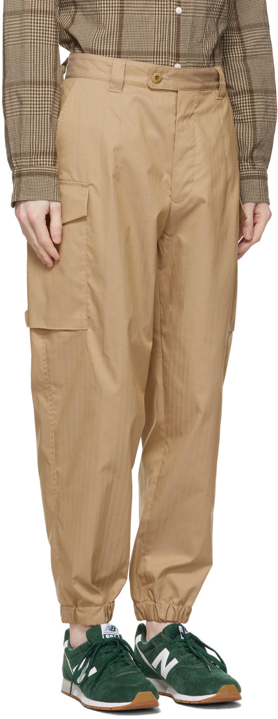 Tapered water-repellent herringbone cargo pants in khaki. Mid-rise. Four-pocket styling. Belt loops at waistband. Darts at front waistband. Flap pocket at outseams. Elasticized cuffs. Button-fly. Tonal hardware. Supplier color: Khaki 100% polyester. Brand: ts(s)