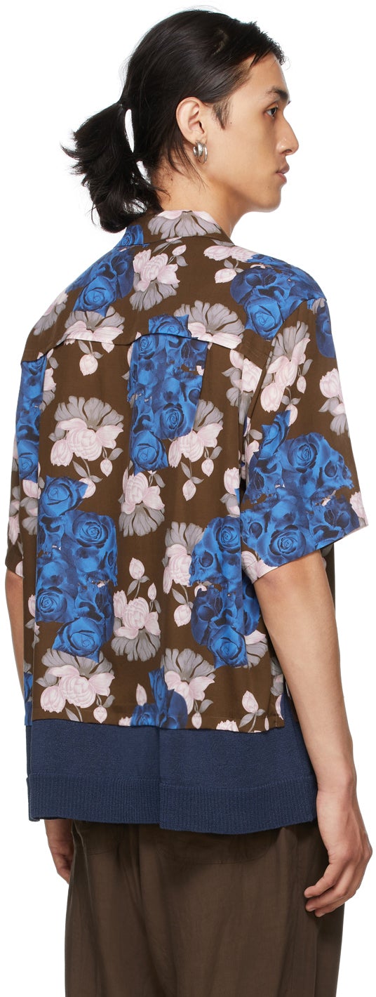 Short sleeve rayon twill shirt in brown featuring printed graphic pattern in multicolor throughout. Open spread collar. Button closure at front. Patch pocket at chest. Knit bast-blend underlay in blue at hem. Modified vented side-seams. Supplier color: Brown base Body: 100% rayon. Trim: 58% polyester, 42% bast fibre. Brand: Undercover