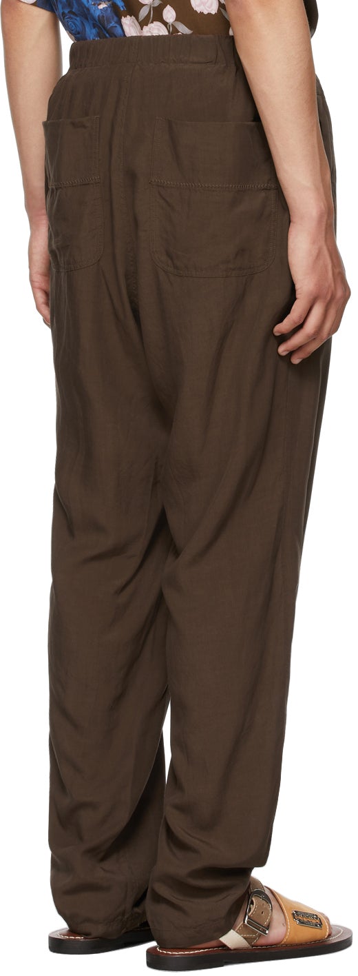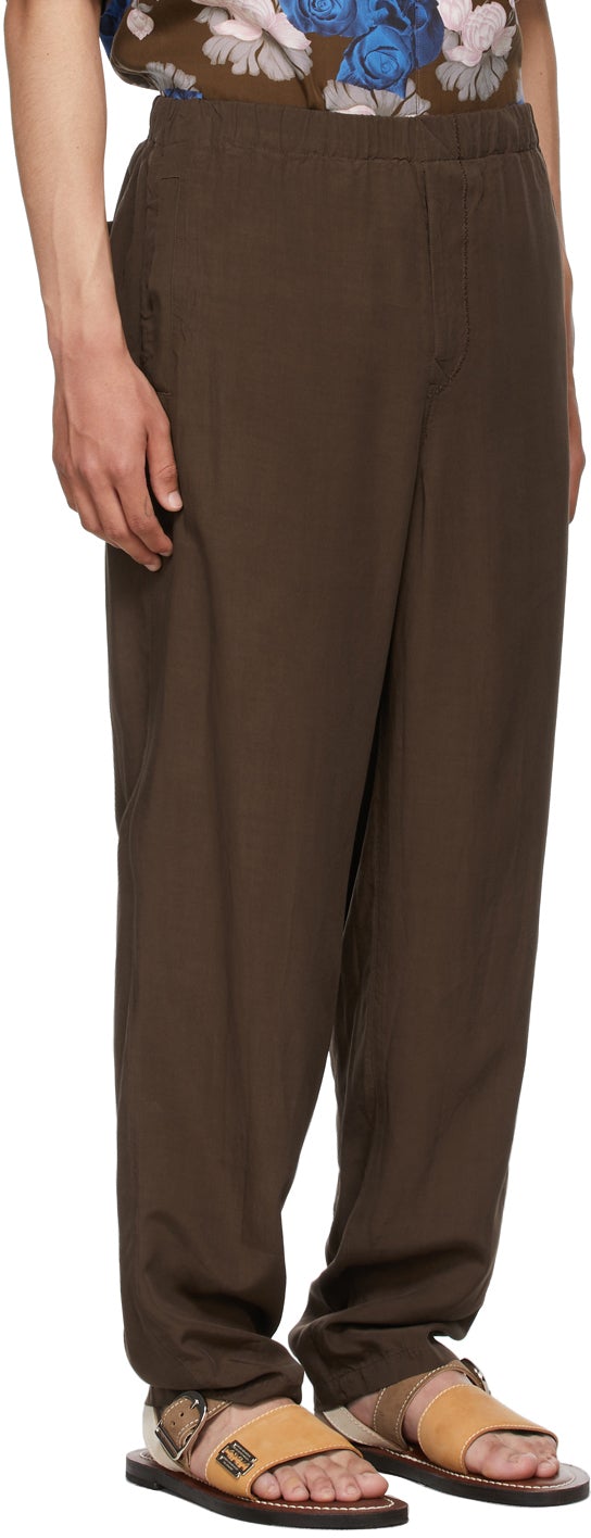 Relaxed-fit rayon twill trousers in brown. Mid-rise. Four-pocket styling. Concealed drawstring at elasticized waistband. Zip-fly. Tonal hardware. Supplier color: Brown 100% rayon. Brand: Undercover