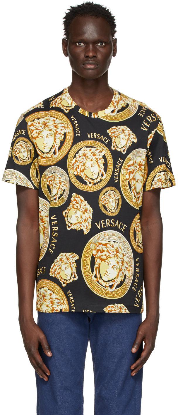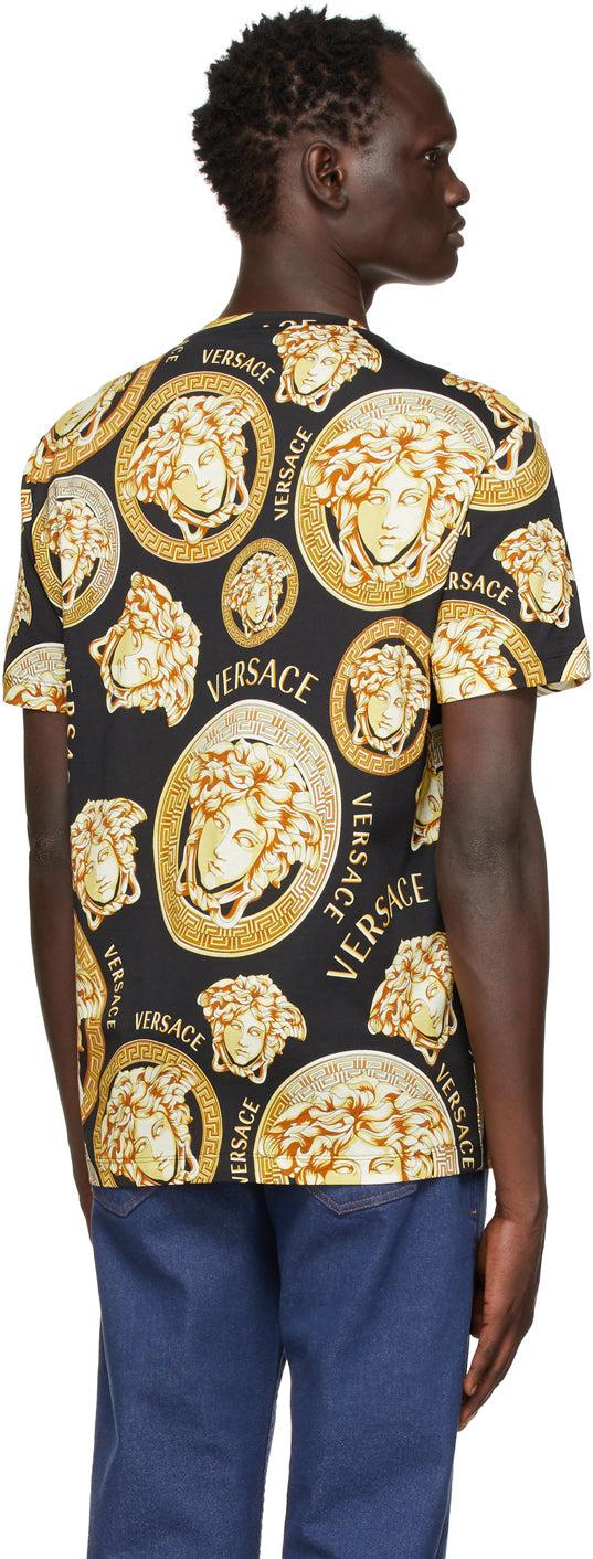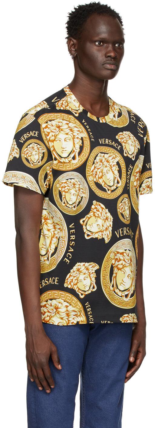 Short sleeve cotton jersey T-shirt in black featuring logo graphic pattern in tones of yellow throughout. Rib knit crewneck collar. Supplier color: Black/Gold 100% cotton. Brand: Versace