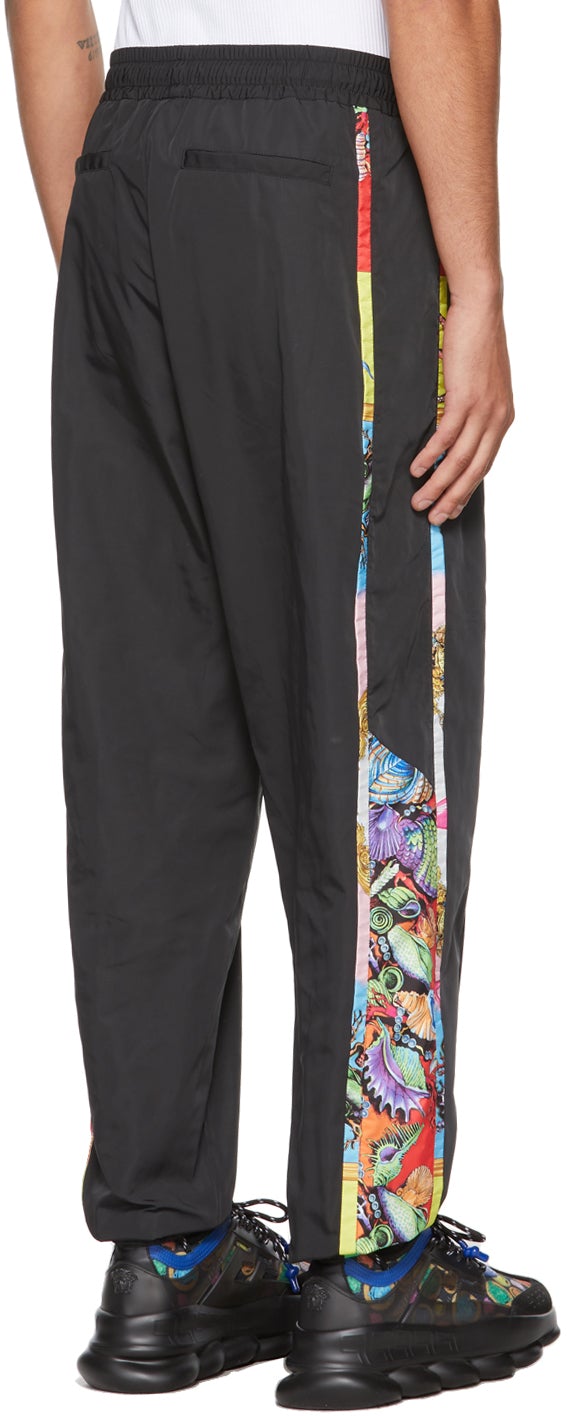 Tapered technical taffeta lounge pants in black. Mid-rise. Four-pocket styling. Drawstring at waistband. Central pinched seams at front. Graphic pattern printed in multicolor at outseams. Elasticized cuffs. Zip-fly. Tonal hardware. Supplier color: Black 100% polyester. Brand: Versace