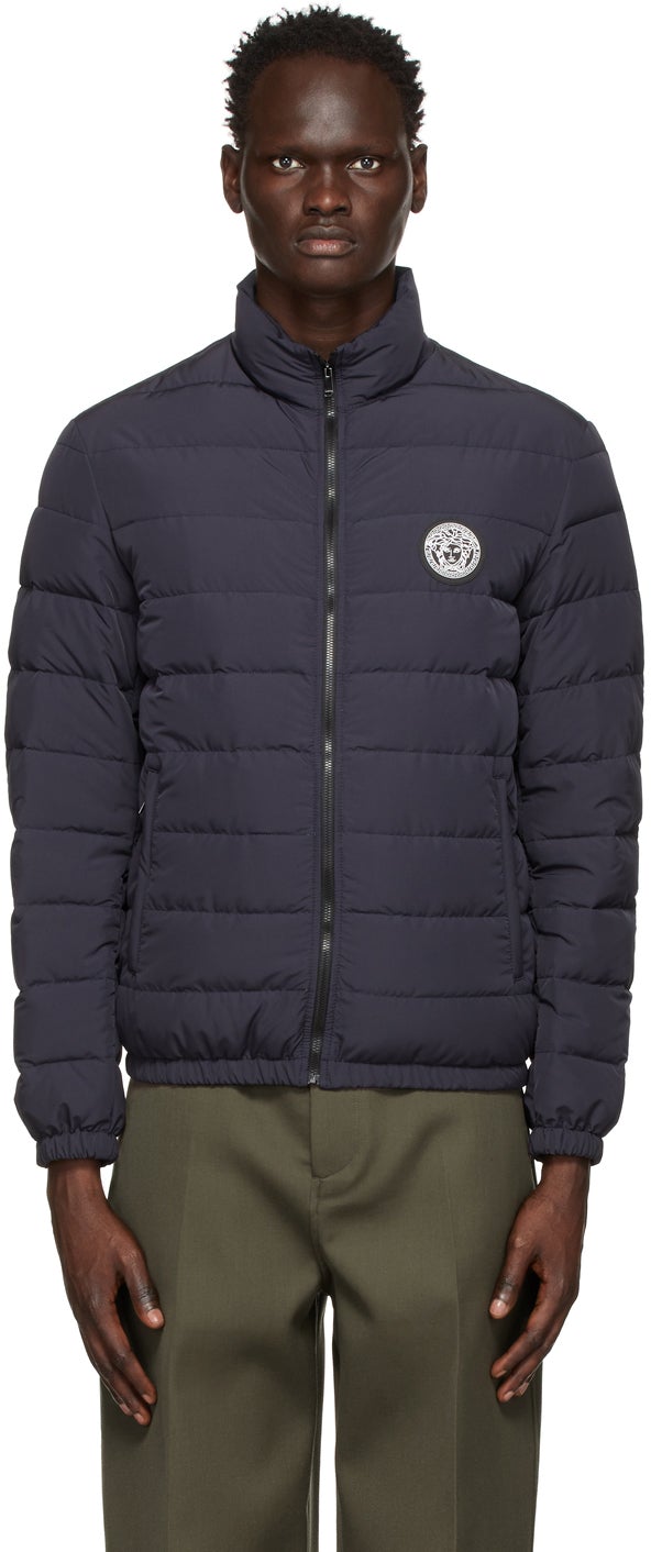 Long sleeve quilted down-filled satin jacket in navy. Stand collar. Zip closure at front. Rubberized signature Medusa patch in black and white at chest. Zippered pockets at waist. Elasticized cuffs and hem. Patch pockets at interior. Tonal satin lining. Fully lined. Black hardware. Satin drawstring pouch included. Fill: 90% goose down, 10% goose feather. Supplier color: Navy Body: 100% polyester. Trim: 100% cotton. Lining: 100% polyester. Brand: Versace