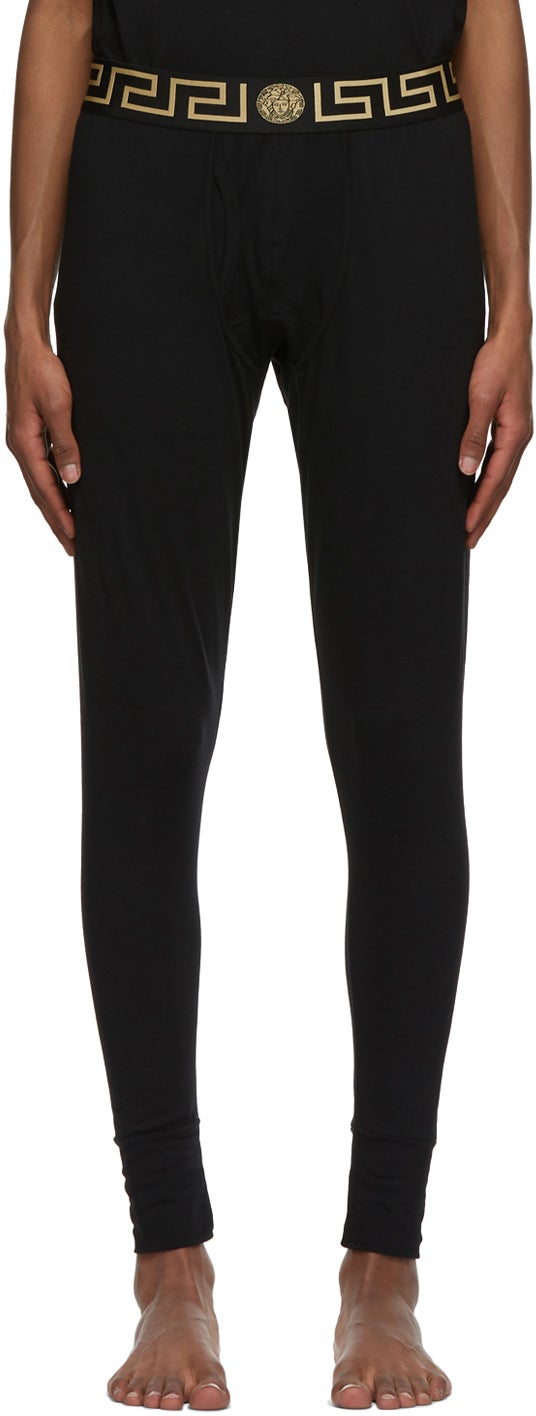 Stretch cotton jersey lounge pants in black. Mid-rise. Signature Medusa and Greek key pattern knit in gold-tone at elasticized waistband. Rib knit cuffs. Supplier color: Black Body: 94% cotton, 6% elastane. Trim: 82% polyester, 9% elastane, 9% polyamide. Brand: Versace Underwear
