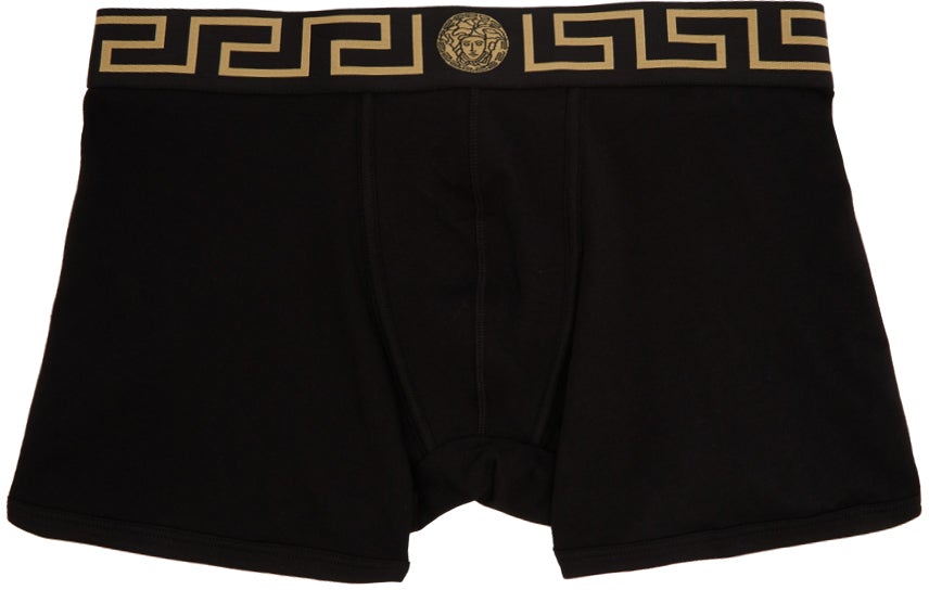 Stretch cotton jersey boxer briefs in black. Mid-rise. Signature Medusa and Greek key pattern knit in gold-tone at elasticized waistband. Supplier color: Black/Gold 94% cotton, 6% elastane. Brand: Versace Underwear
