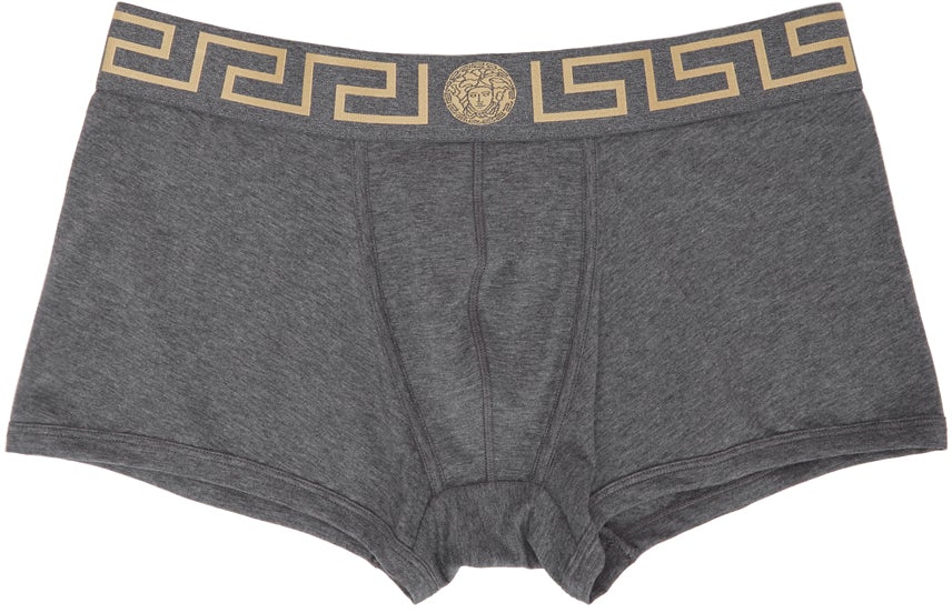 Stretch cotton jersey boxer briefs in grey. Mid-rise. Signature Medusa and Greek key pattern knit in gold-tone at elasticized waistband. Supplier color: Melange grey 94% cotton, 6% elastane. Brand: Versace Underwear
