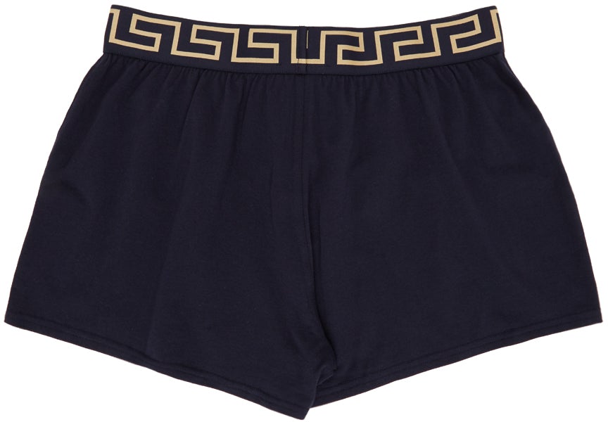 Stretch cotton boxers in navy. Mid-rise. Signature Greek key pattern and Medusa graphic knit in gold-tone at elasticized waistband. Button-fly. Supplier color: Blue/Gold 94% cotton, 6% elastane. Brand: Versace Underwear