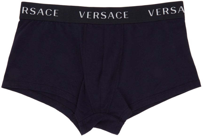 Stretch cotton jersey boxer briefs in navy. Low-rise. Logo knit in white at elasticized waistband. Supplier color: Dark blue 96% cotton, 4% elastane. Brand: Versace Underwear