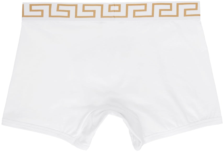 Pack of two stretch cotton jersey boxer briefs in white. Mid-rise. Signature Medusa and Greek key pattern knit in gold-tone at elasticized waistband. Supplier color: White/White 94% cotton, 6% elastane. Brand: Versace Underwear