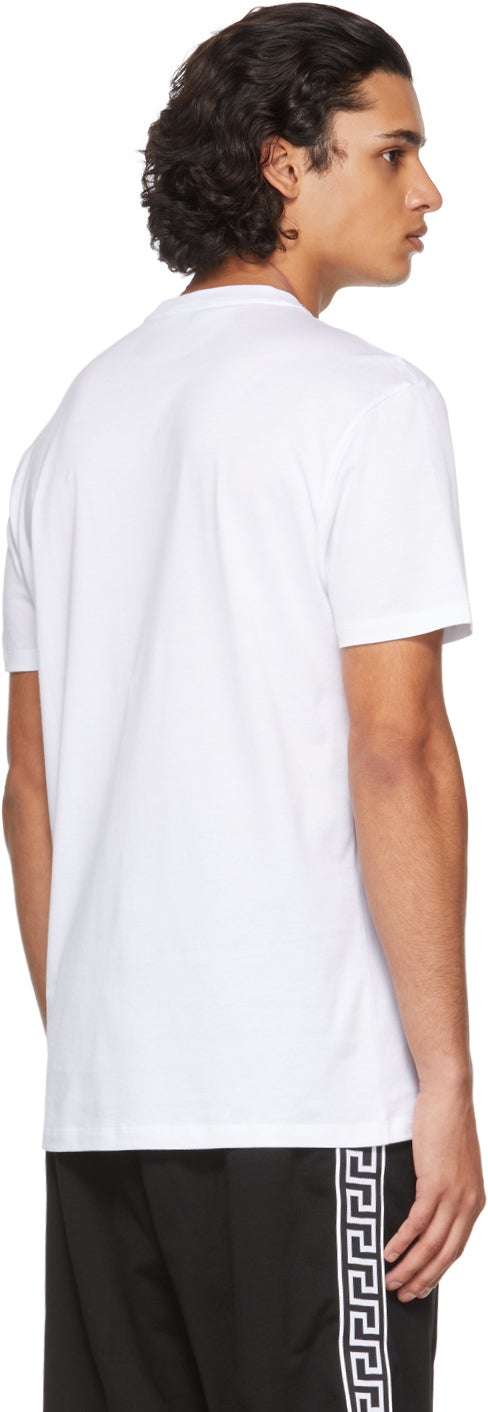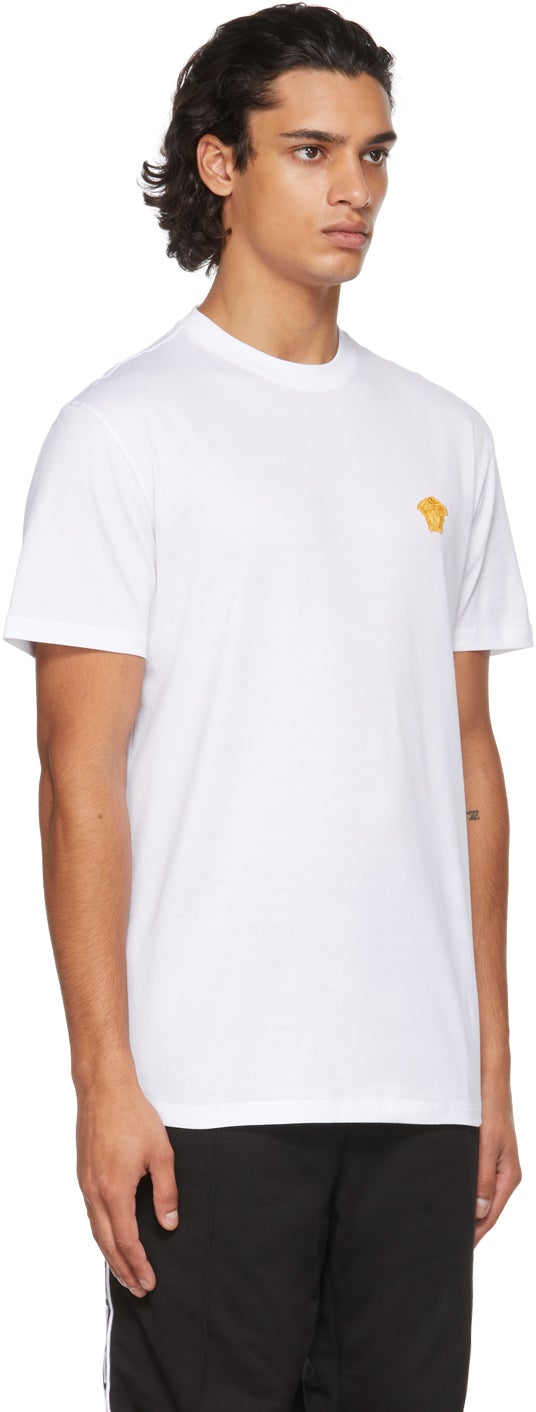 Short sleeve cotton jersey T-shirt in white. Rib knit crewneck collar. Signature Medusa embroidered in gold-tone at chest. Supplier color: White 100% cotton. Brand: Versace