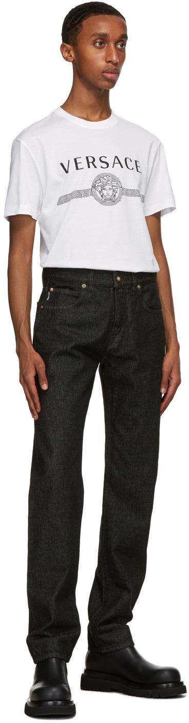 Short sleeve cotton jersey T-shirt in white. Rib knit crewneck collar. Logo and signature Medusa printed in black at chest. Supplier color: White 100% cotton. Brand: Versace