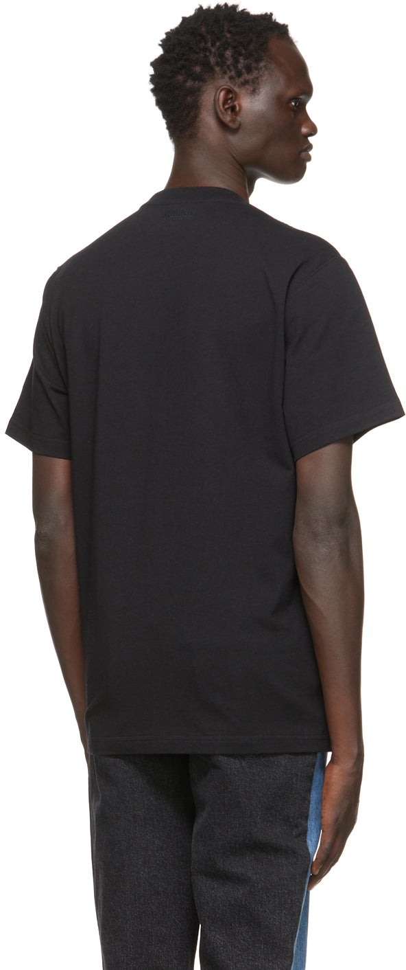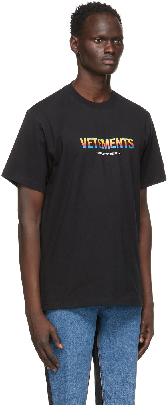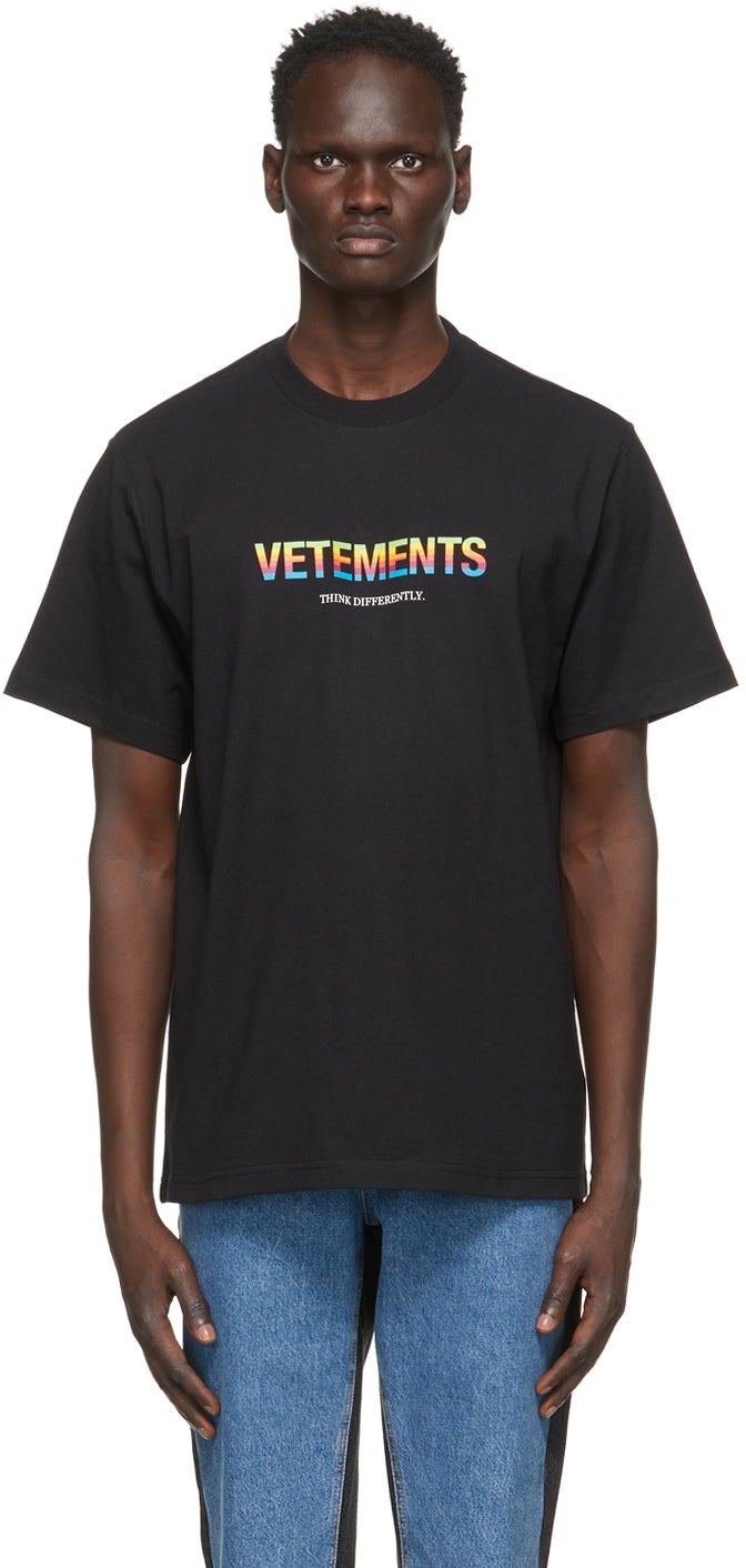 Short sleeve cotton jersey T-shirt in black. Rib knit crewneck collar. Multicolor logo and text printed at chest. Tonal logo embroidered at back collar. Supplier color: Black 100% cotton. Brand: VETEMENTS