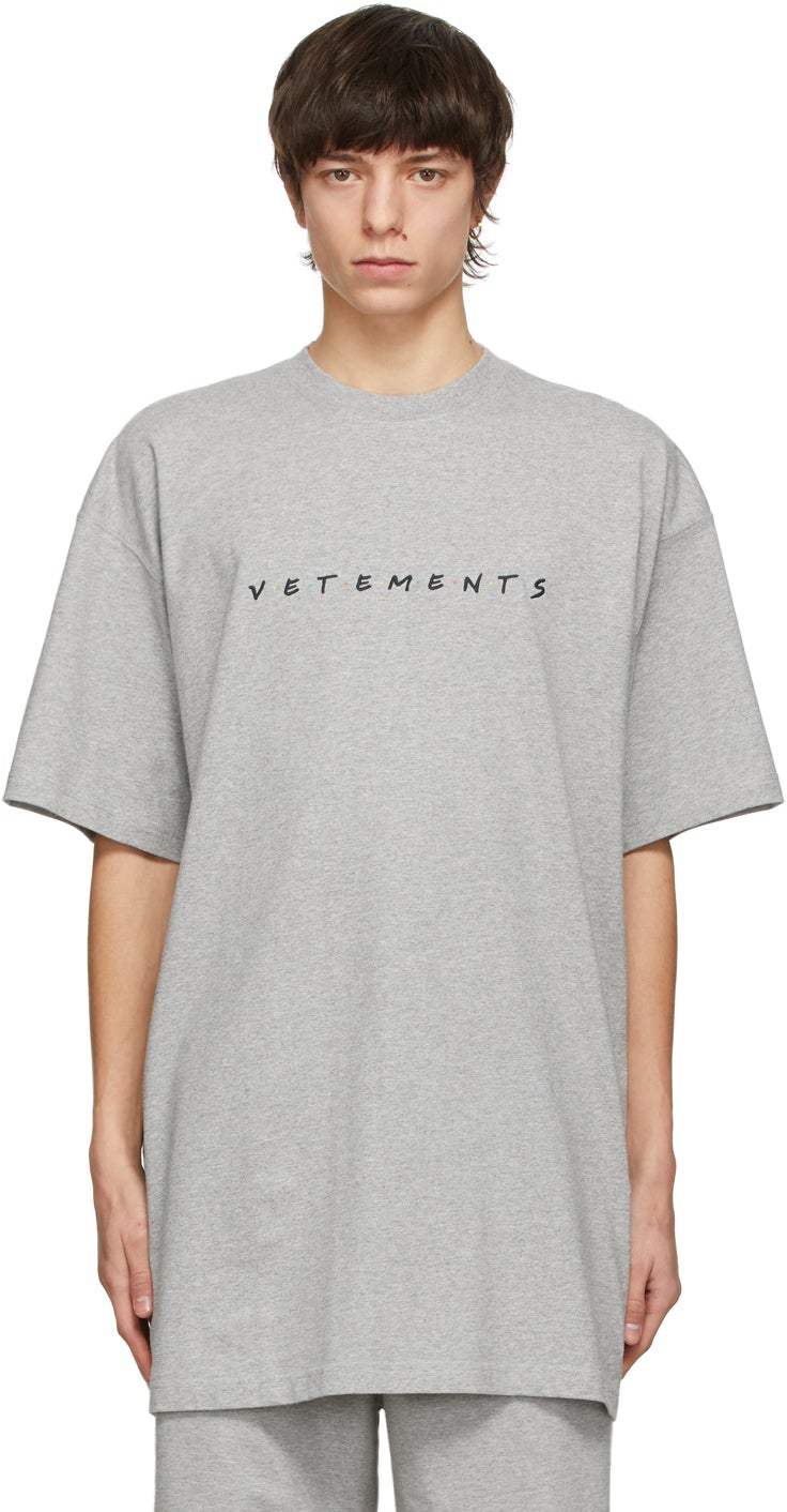 Short sleeve cotton jersey T-shirt in grey. Rib knit crewneck collar. Logo embroidered in black and multicolor at front. Tonal logo embroidered at back collar. Supplier color: Grey melange 100% cotton. Brand: VETEMENTS